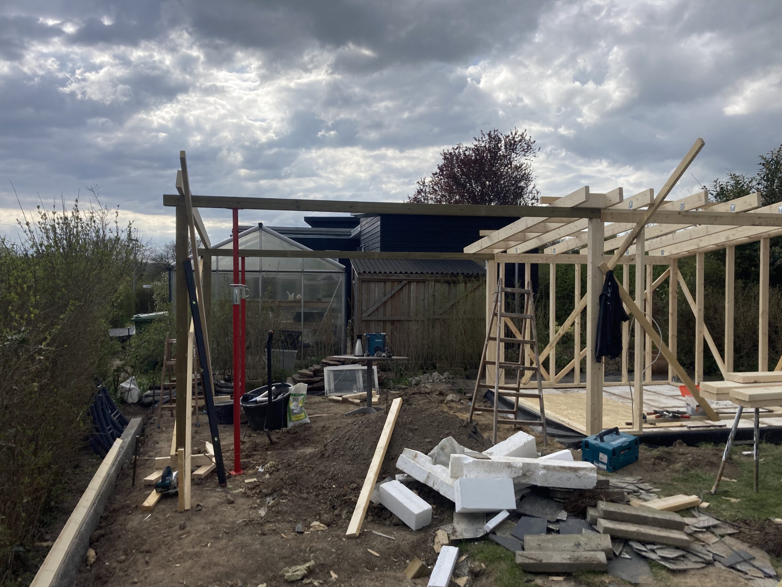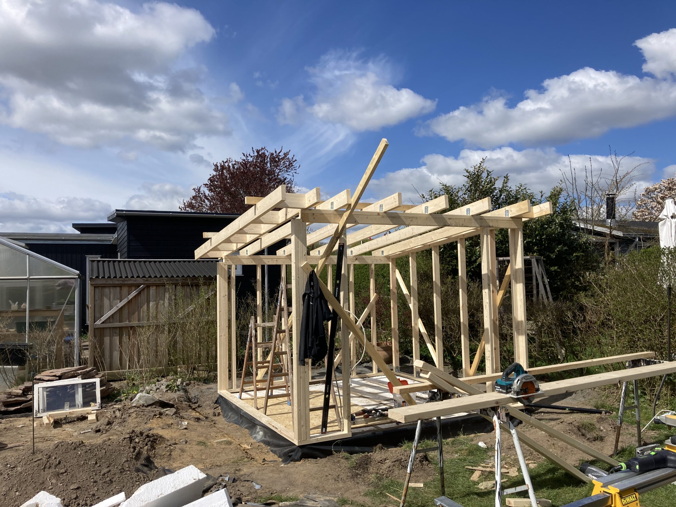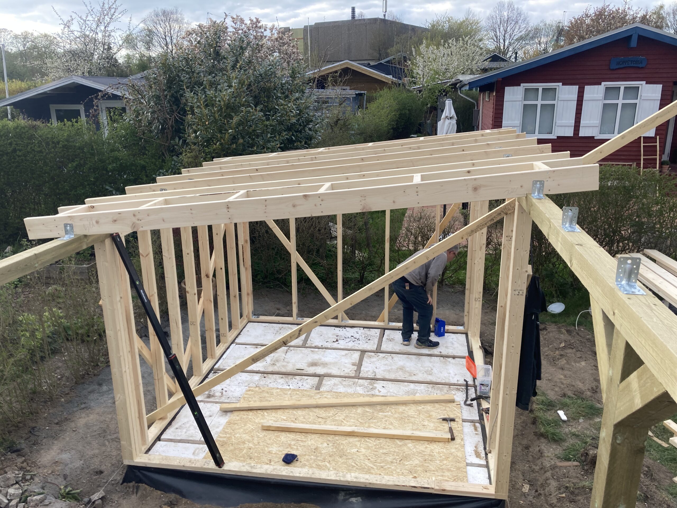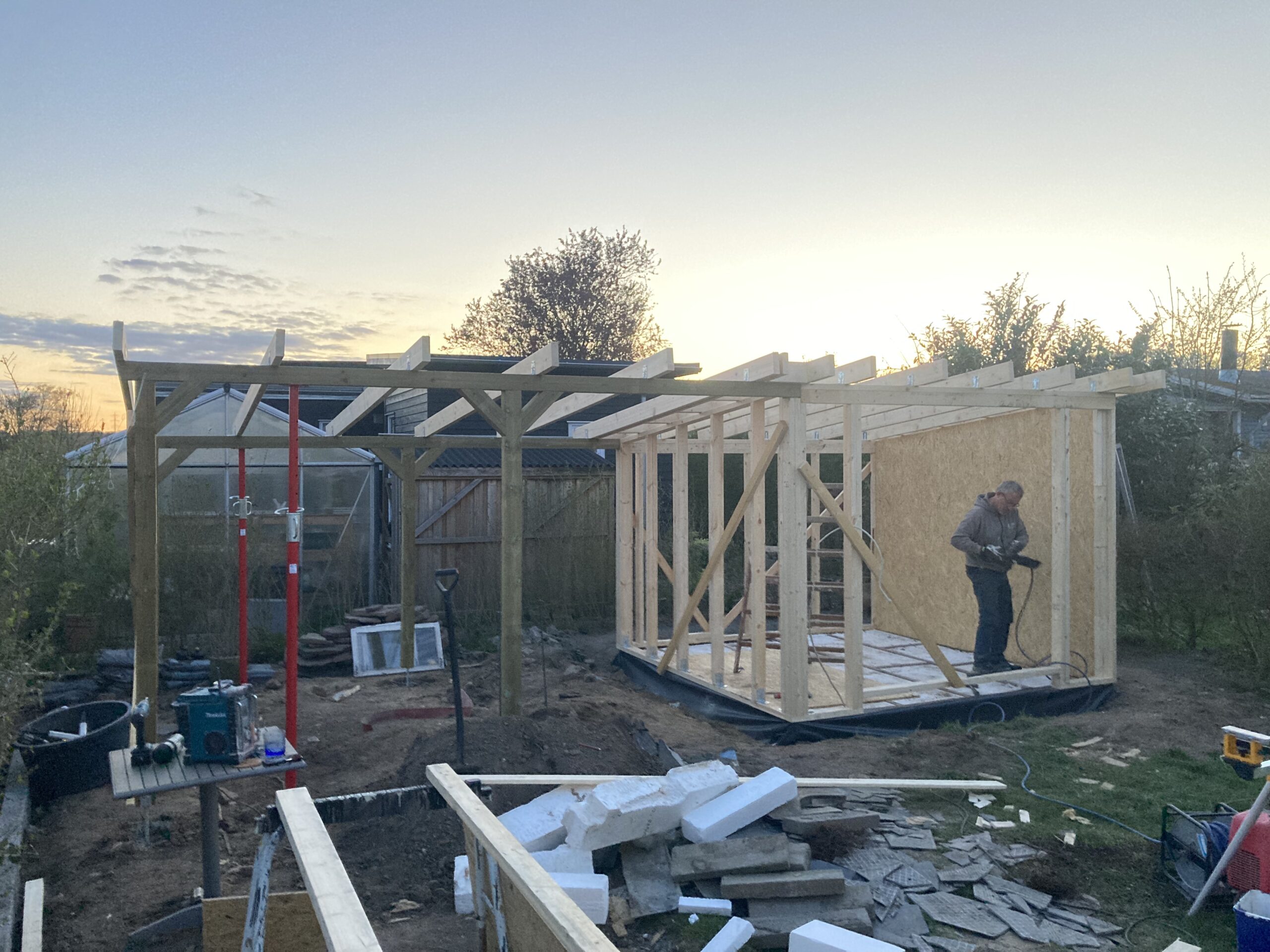 Det gamle skur i haven kunne ikke konverteres til et anneks, så der måtte lidt nyt træ til. Det var vist også meget godt, bundrammen var ikke helt frisk længere. Det blev til et fint lille anneks med plads til overnattende gæster og en lækker overdækket terrasse. Bygget i samme materialer som kolonihavehuset, så der ligesom er en rød tråd i hele projektet. Bygherre var selv på pladsen til at give en hjælpende hånd med.