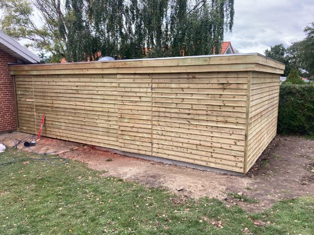 Da det gamle redskabsskur i garagen skulle lægges til parkeringen i garagen, skulle der et nyt skur til.Kunden havde fået soklen støbt, efter mine anvisninger i forhold til den ønskede beklædning, gavlmuren skulle jo helst ikke være at se mere. En ret simpel konstruktion i træ, boltet fast til soklen, lidt isolering kom der også …