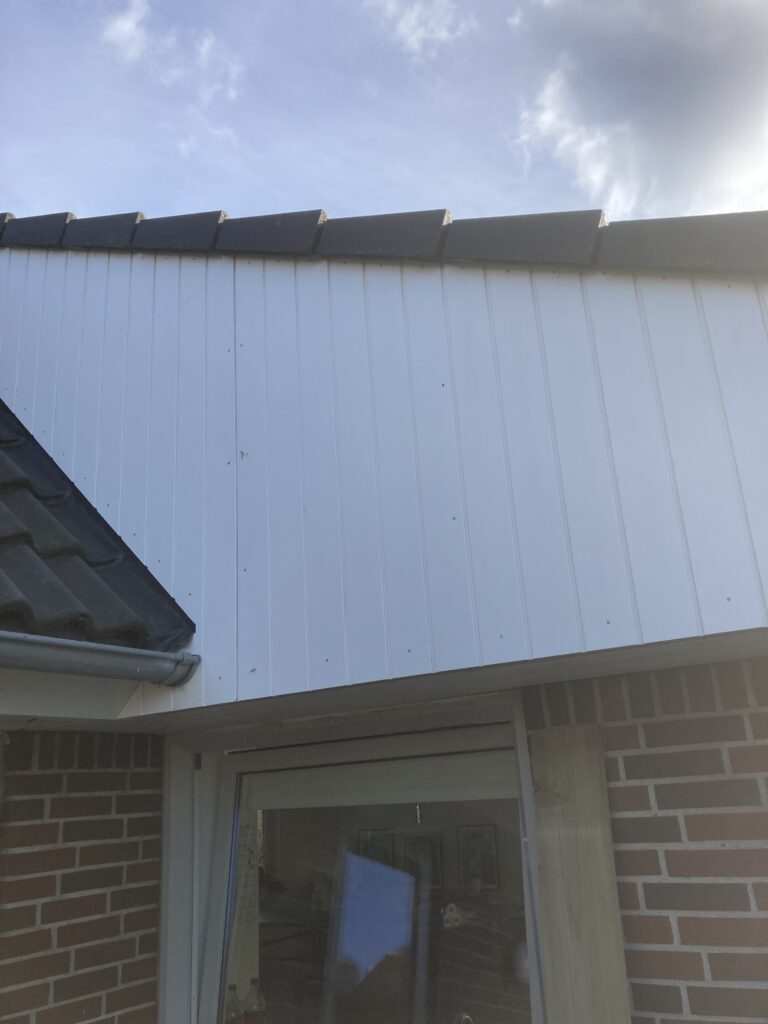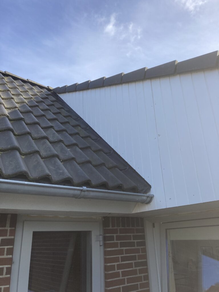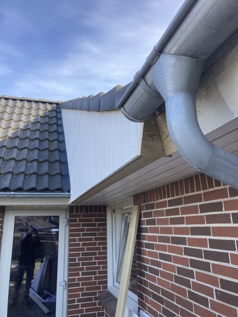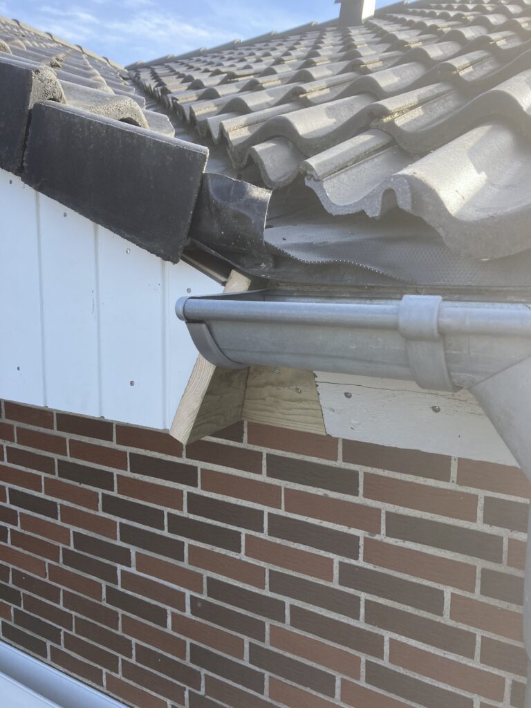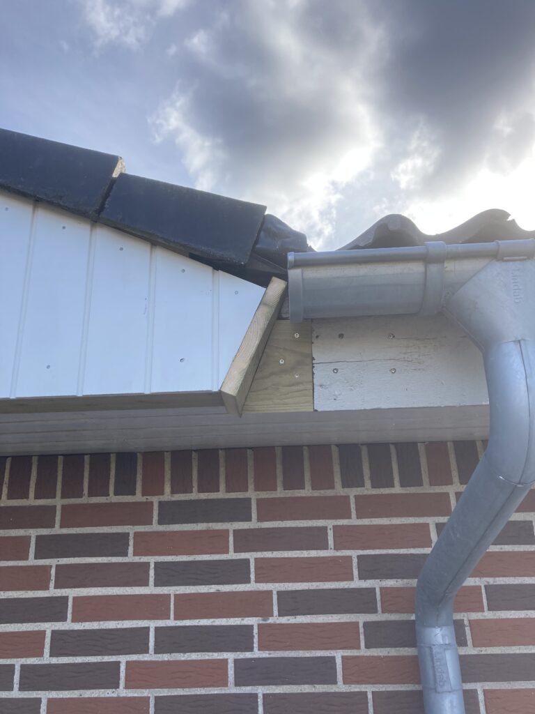 Jeg flyttede den nye gavlbeklædning ud ved at klodse det gamle spær ud, under arbejdet fandt jeg ud af at der ikke var brugt noget til at tætne mellem gavlbeklædningen og tagstenen på garagen. Ydrer mere var der en mindre utæthed i bunden af skotrenden, som havde været lidt hård ved træværket ved under tagrenden, dette blev også udbedret.