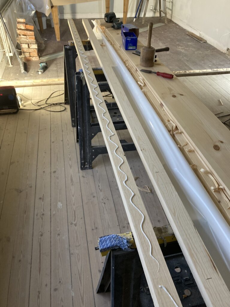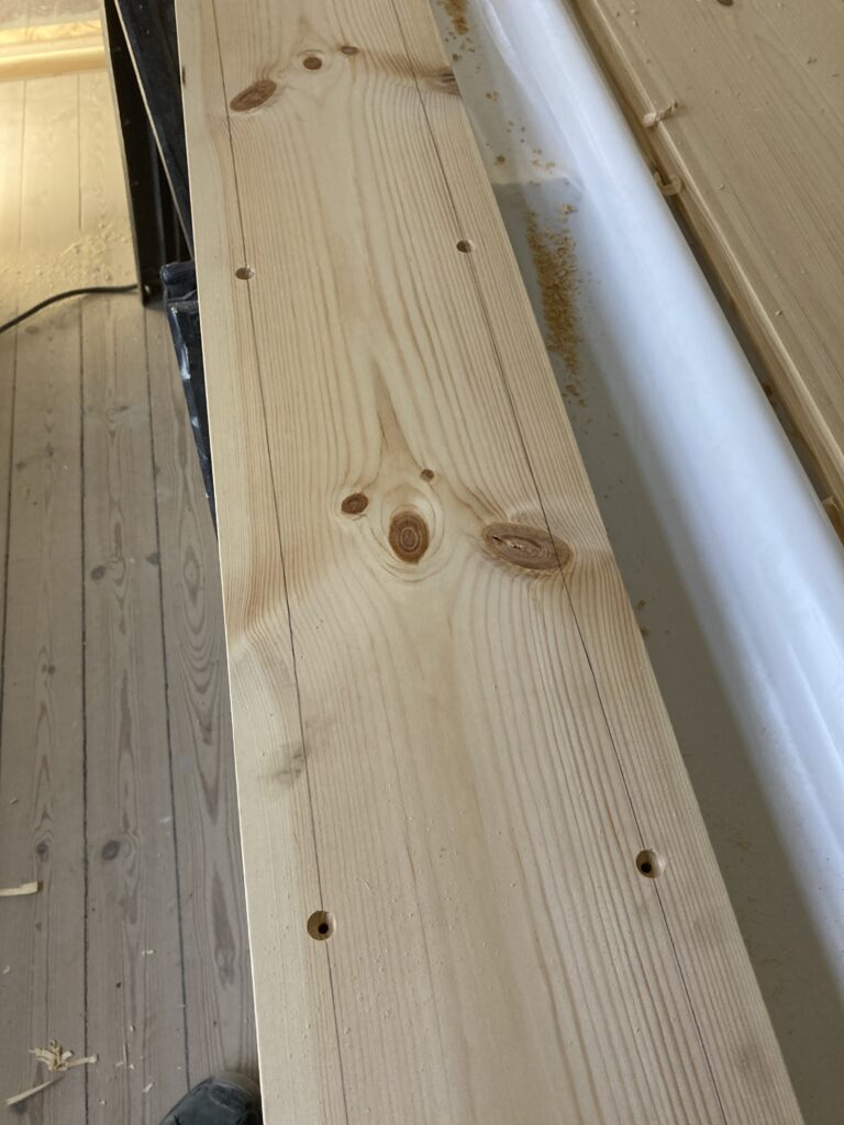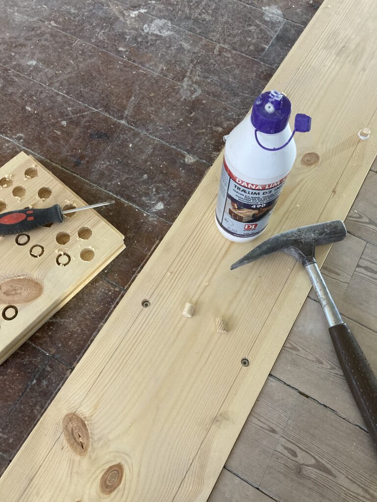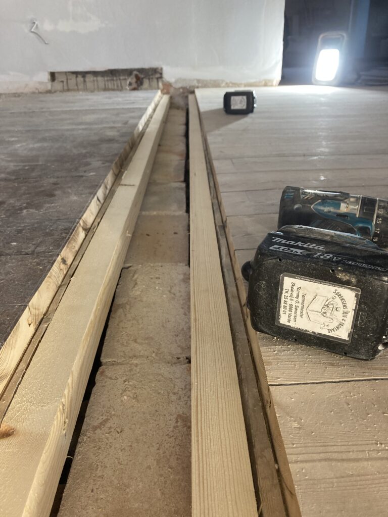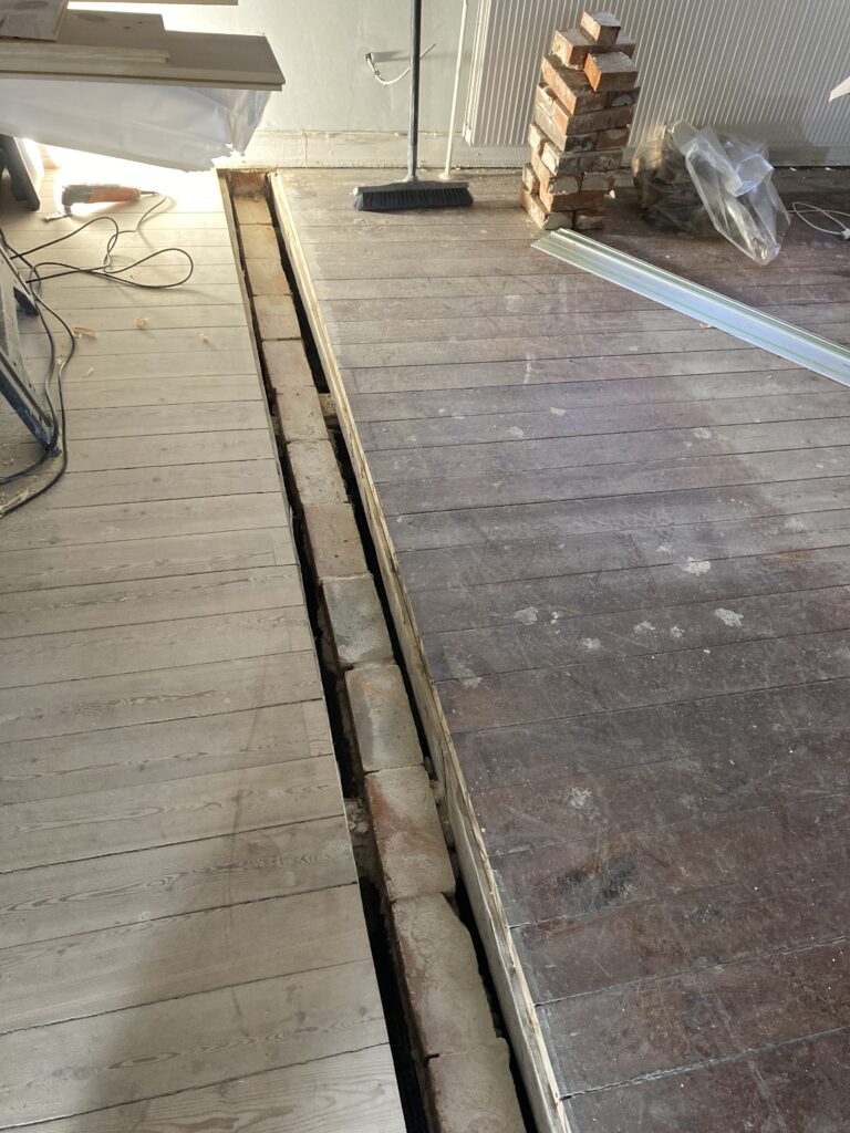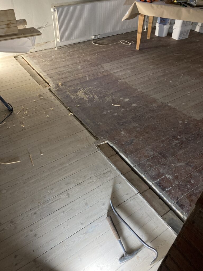 Montage af en gulvplanke mellem to stuer, hvor en væg var blevet fjernet. Det gamle gulv blev skåret sådan, at den nye planke kom til at gå hele vejen over, det giver et noget pænere udseende end hvis man havde lavet to små stykker. Den blev skruet og proppet fast, så er det næsten ikke at se.