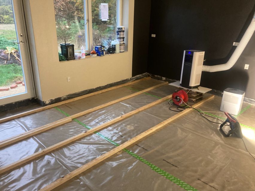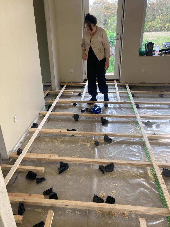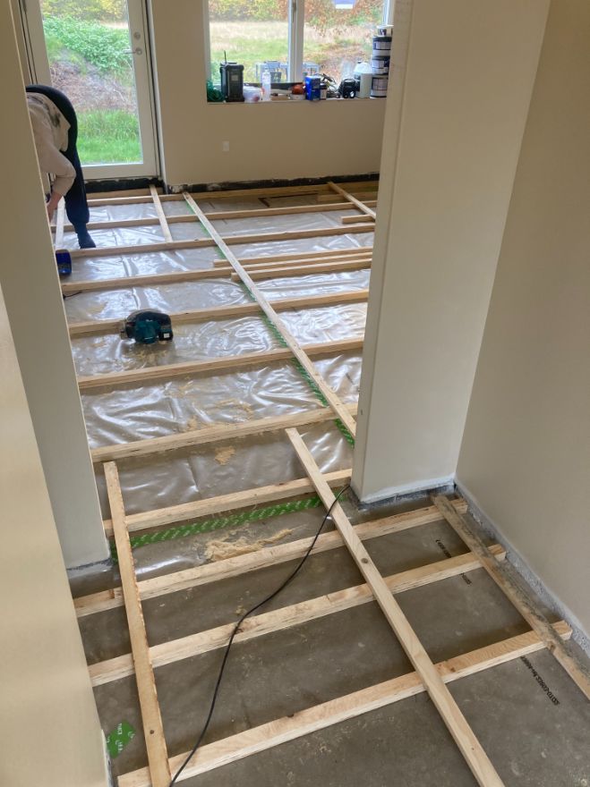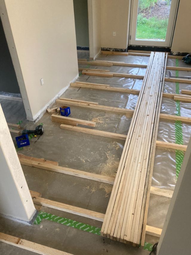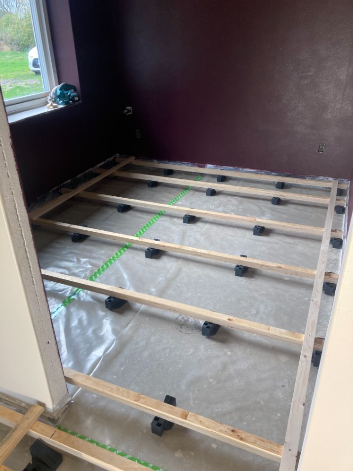 Kunden ønskede her kun hjælp til udlægning af strøer til plankegulvet og opklodsning af samme. Herefter lage hun selv isolering ud imellem strøerne og lage gulvet.