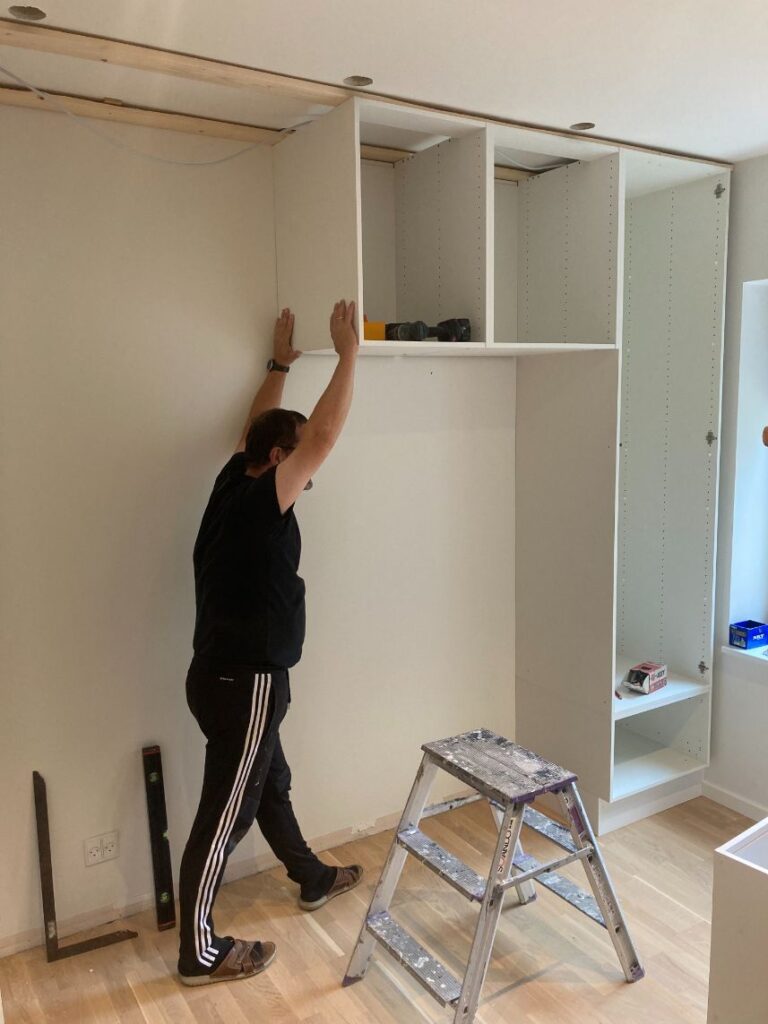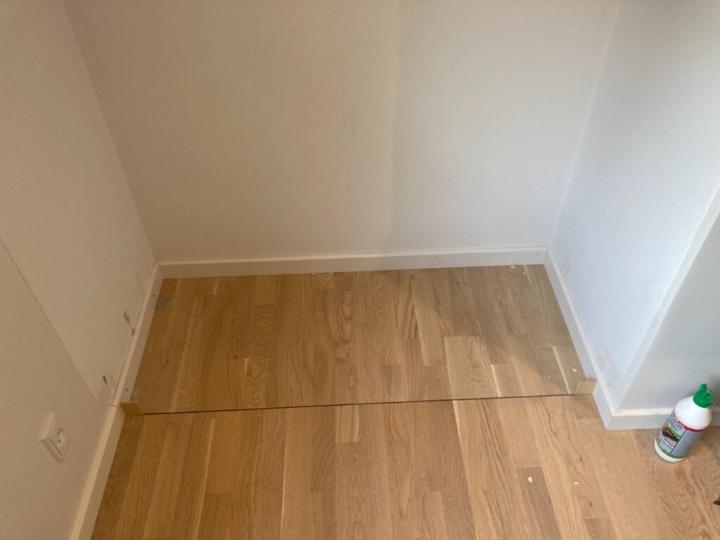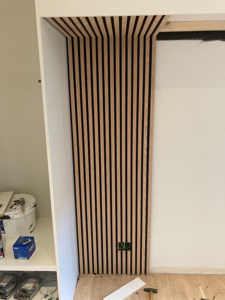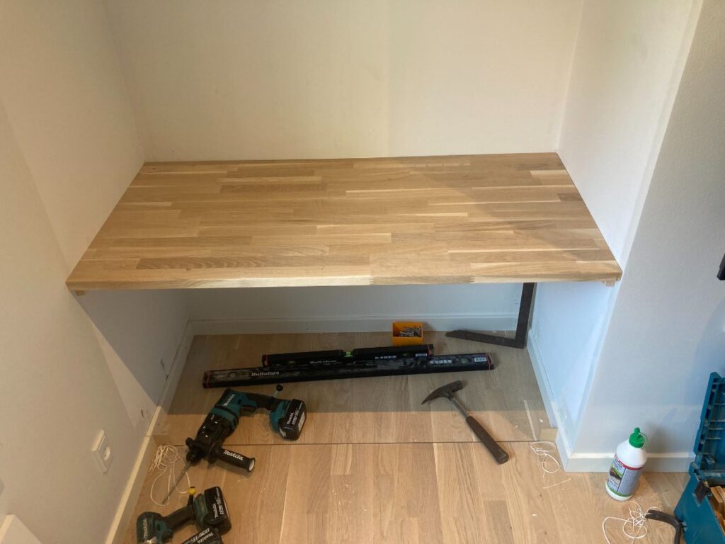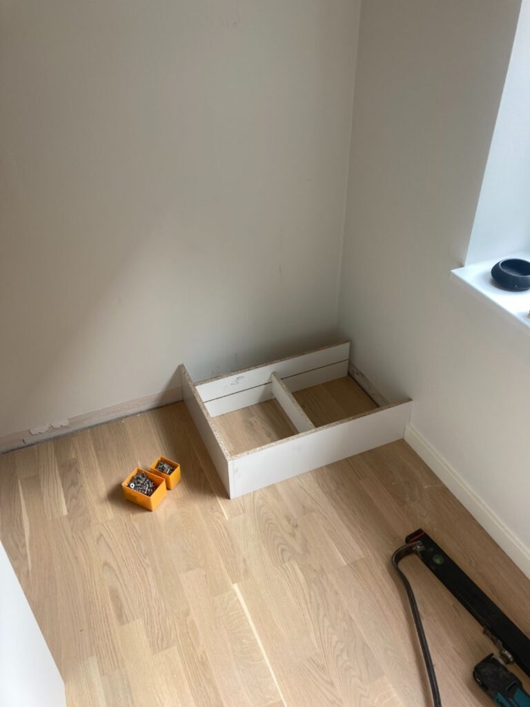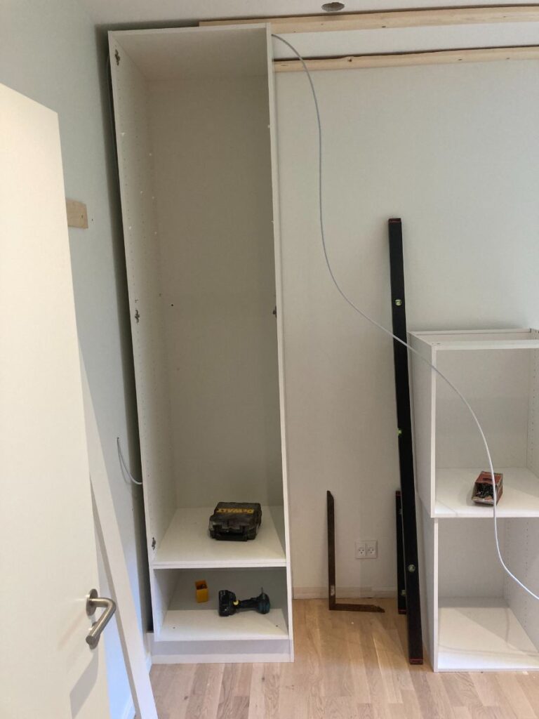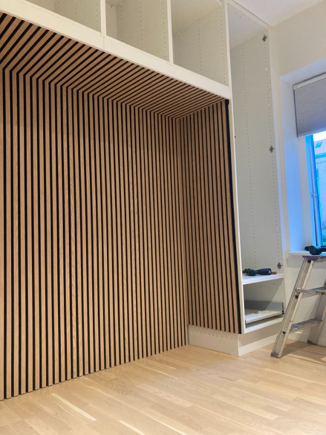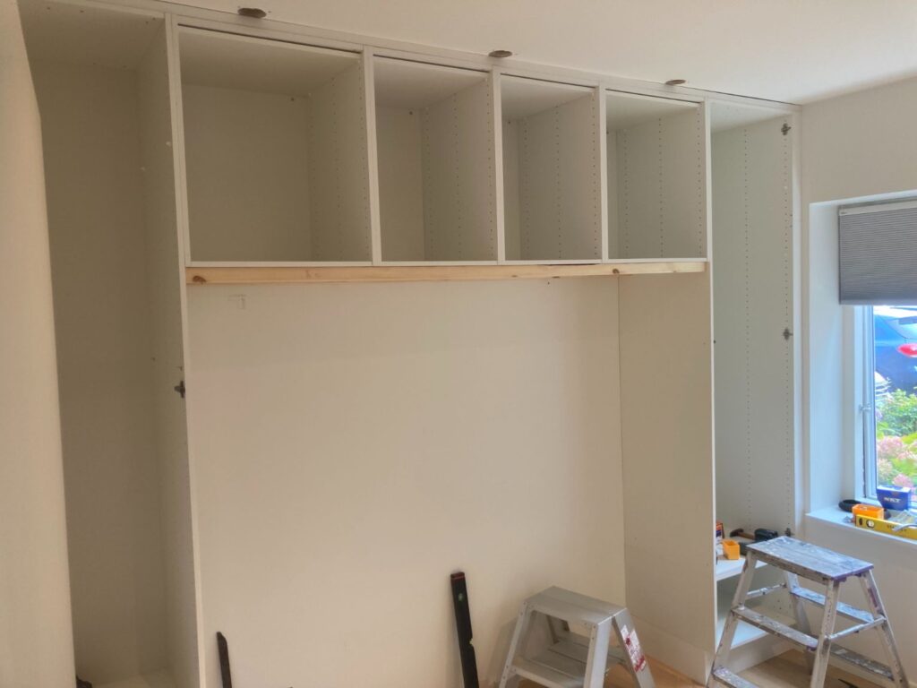 Der manglede lidt opbevaringsplads i lejligheden, så de gamle klædeskabe blev afmonteret og genbrugt, sammen med lidt nye HTH skabe. I hullet fra de gamle klædeskabe blev der lagt gulv og monteret en bordplade. Lydplader monteret for at give det hele et lækkert udseende.