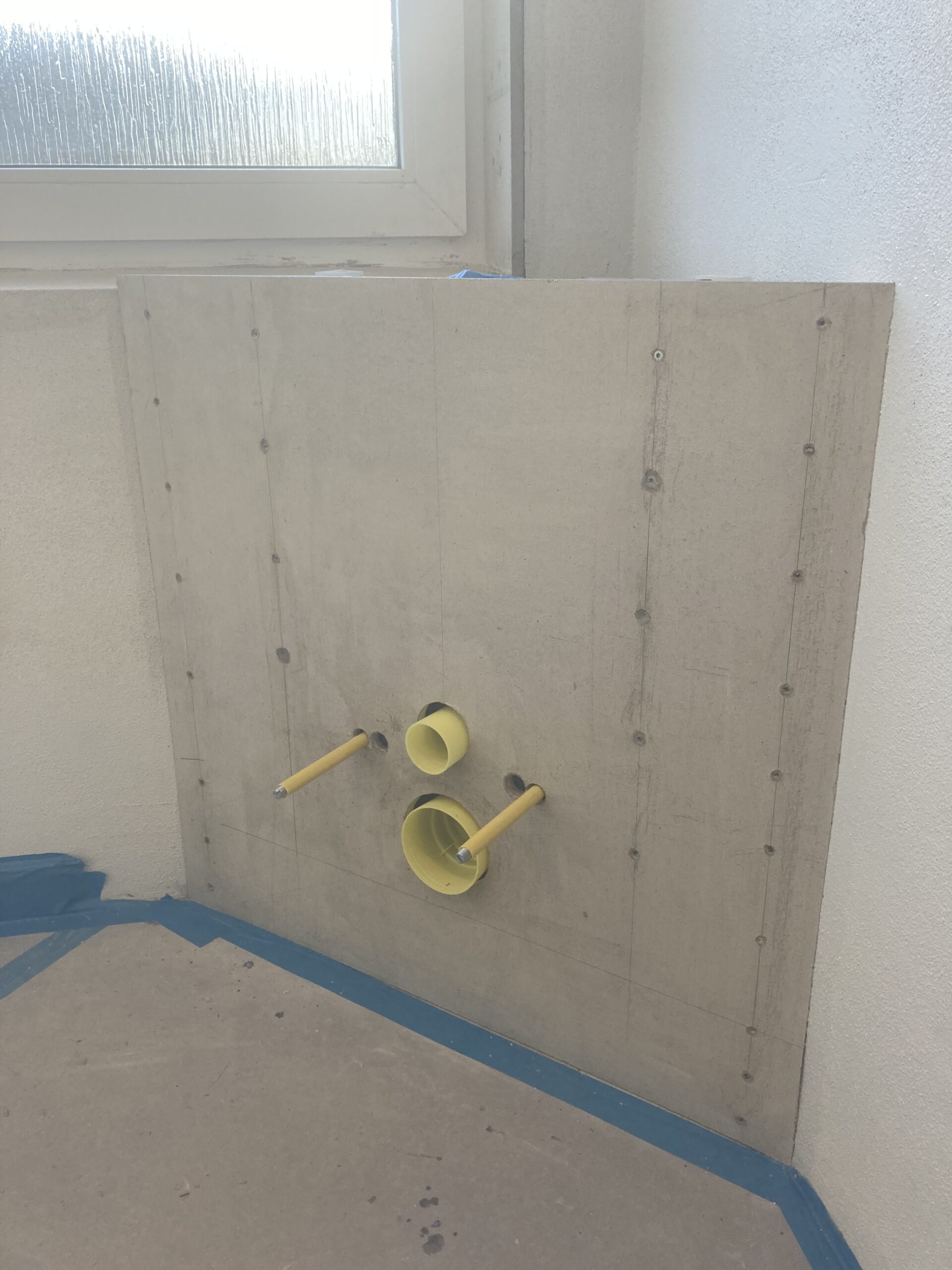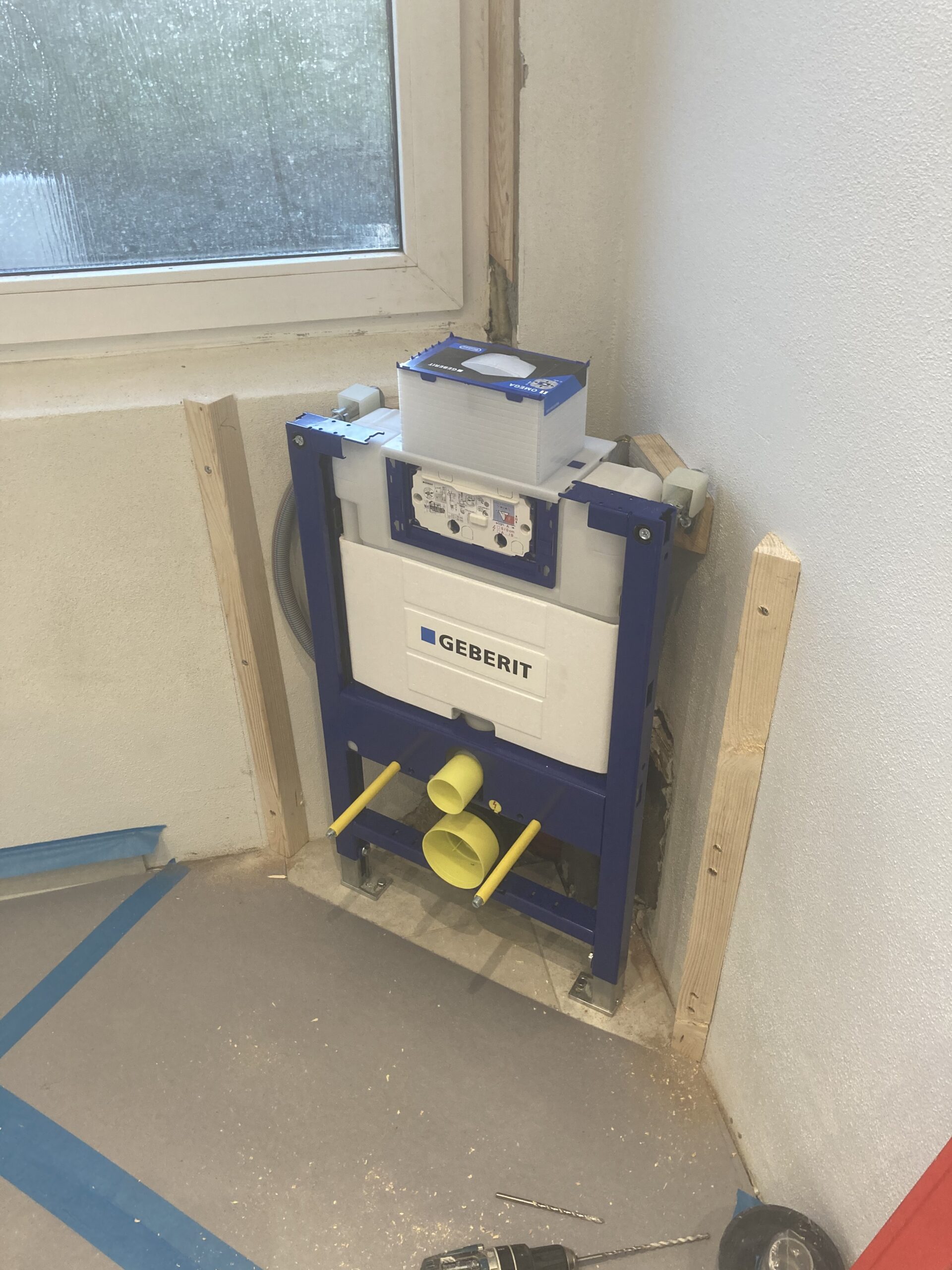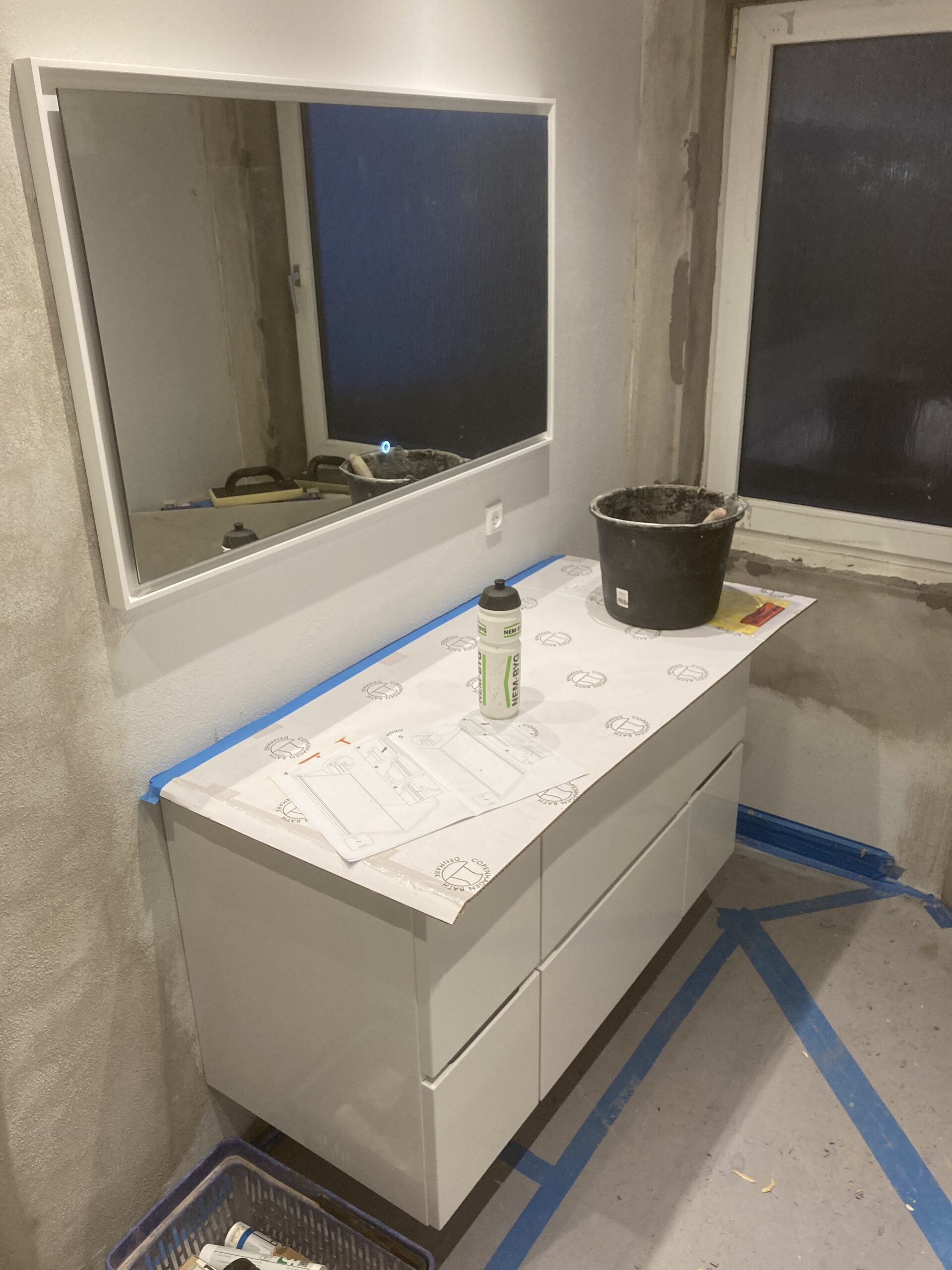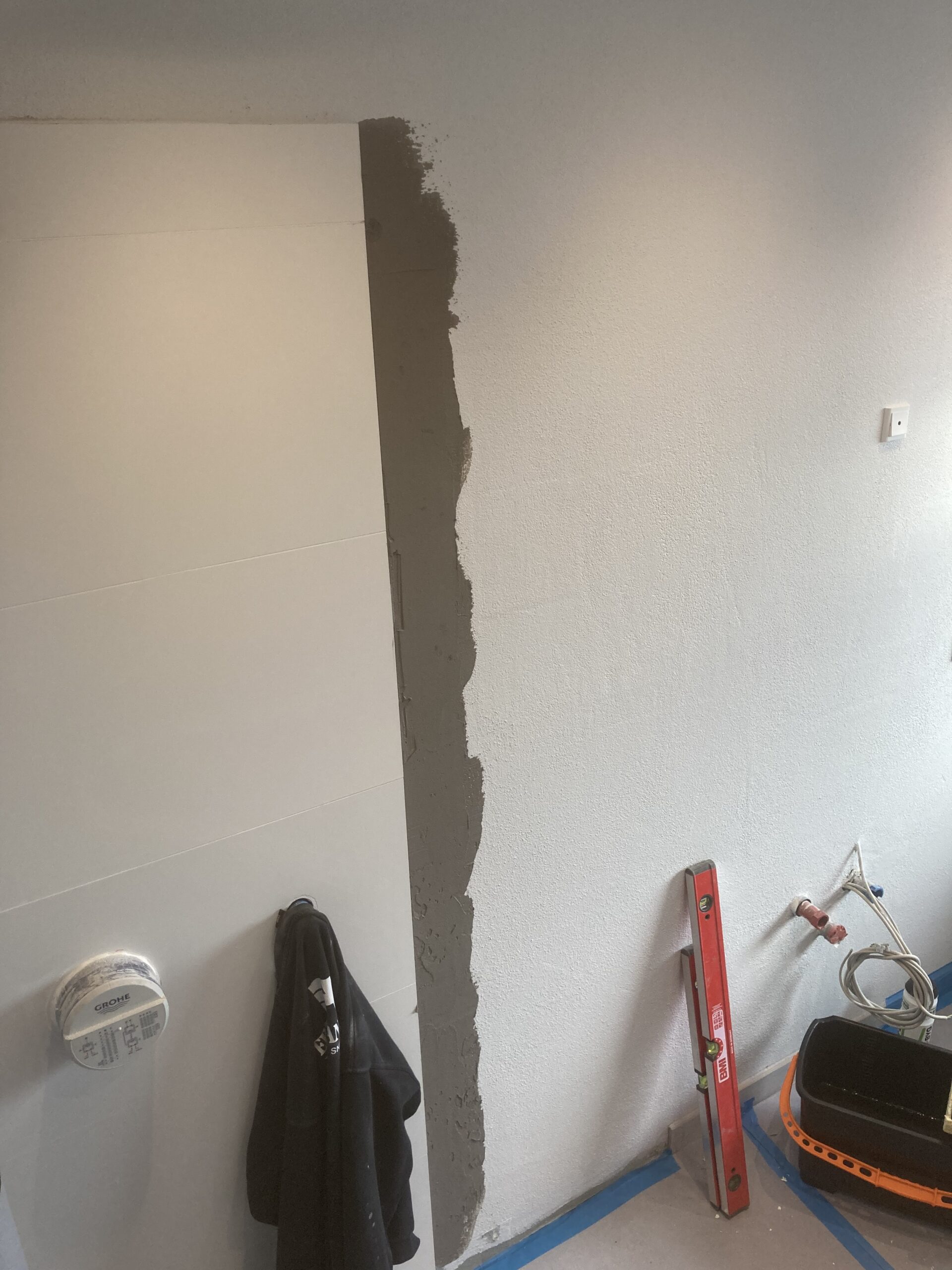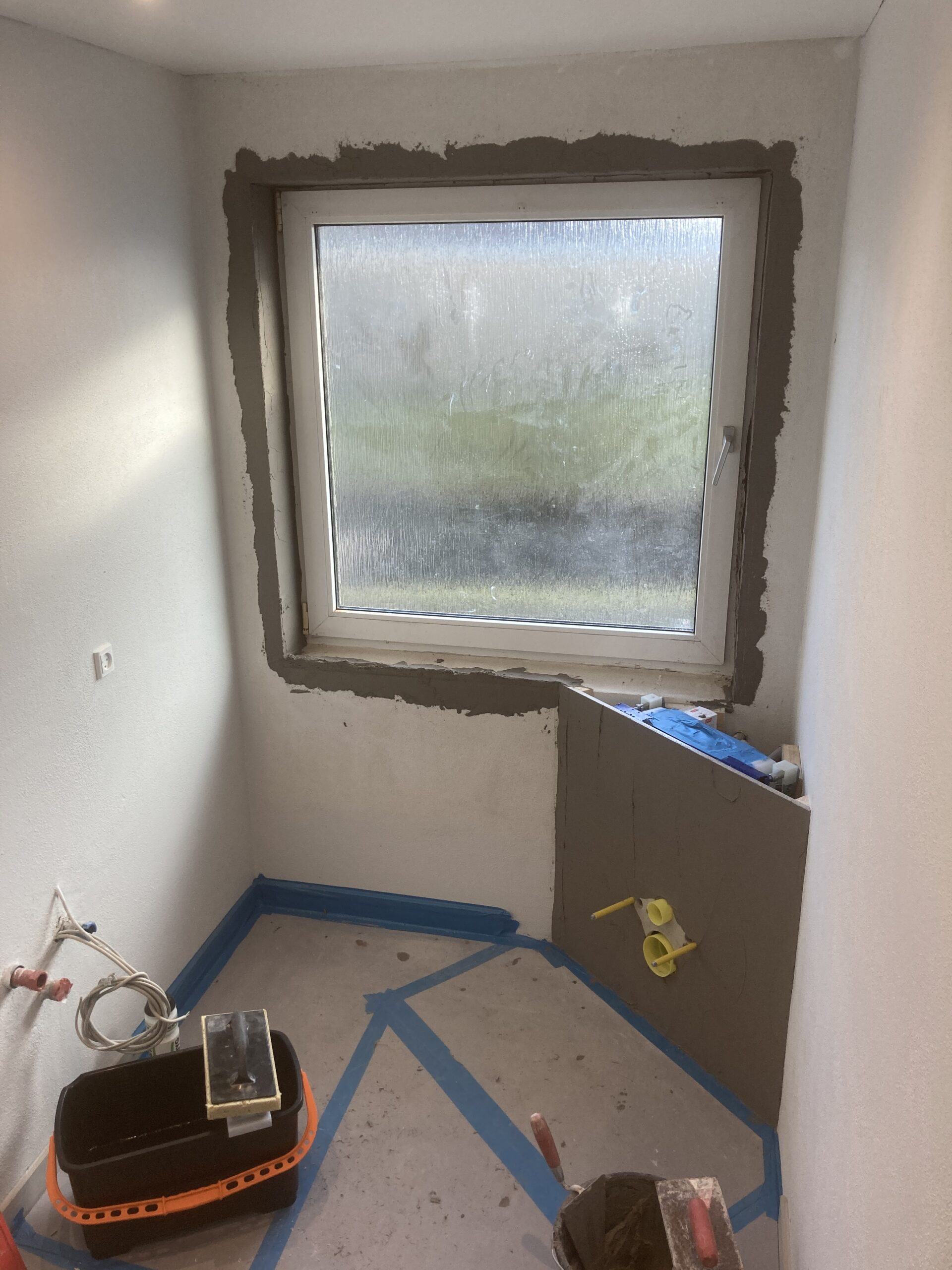 Renovering af badeværelse i Billund, blandt andet nyt gipsloft og dampspærre, ny dør, Gips lysning, inddækning af stativ til hænge toilet. Og rette lidt i murerens puds, samt puds af toilettet.