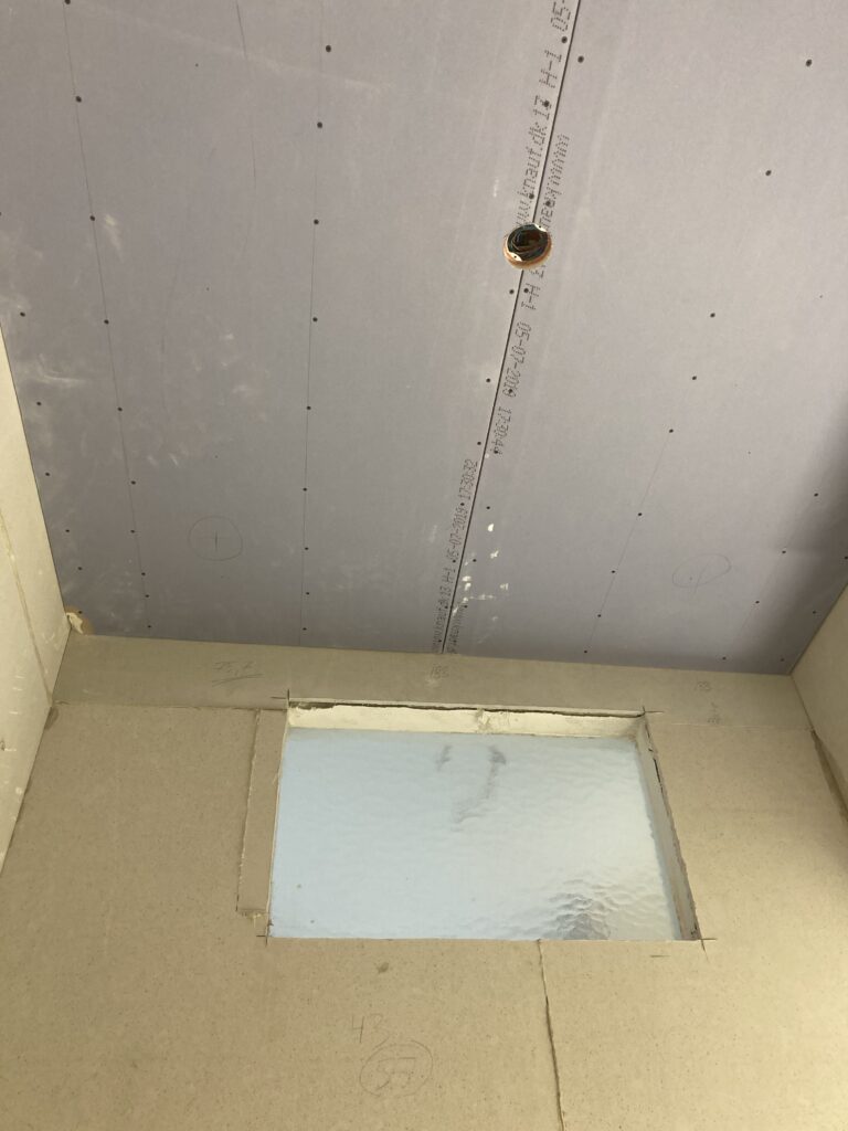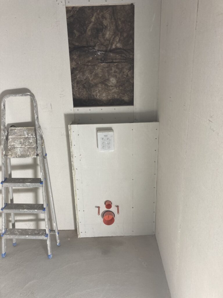 Kunden havde selv stået for nedbrydningen af det gamle badeværelse. Jeg stod for at lave nyt loft, inddækning af nyt hængetoilet mm.