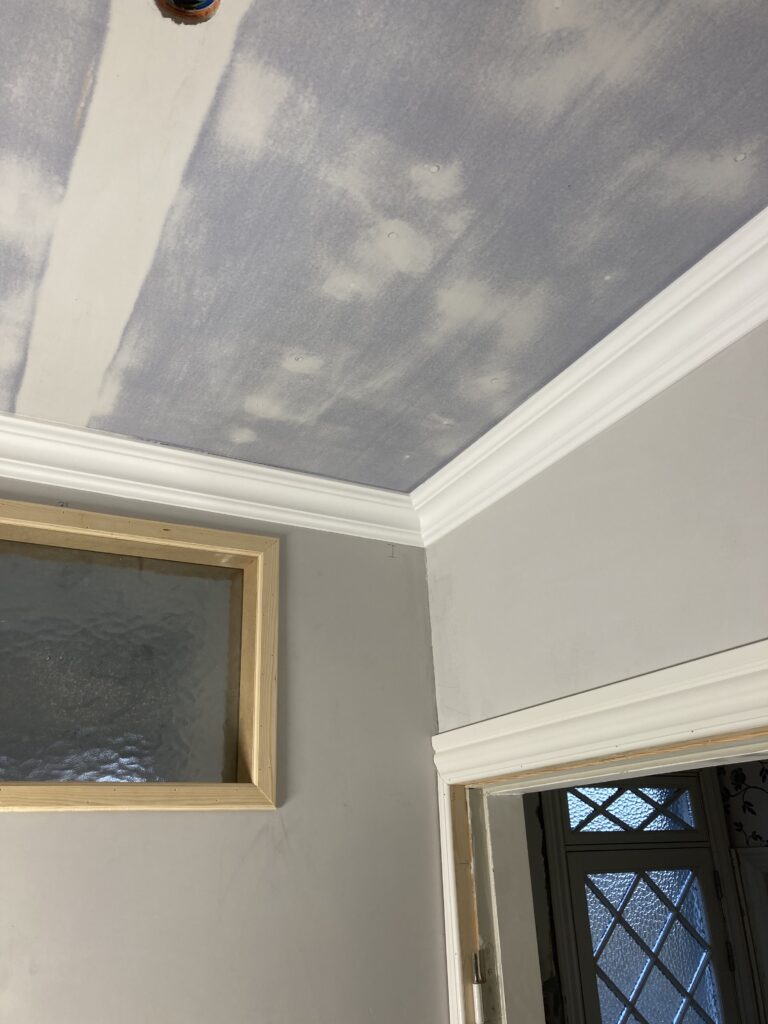 I entreen var der lagt nye fliser her skulle de gamle fodlister/indfatninger genmonteres, her blev der også monteret stuk langs kanterne i loftet samt en flot rosette.