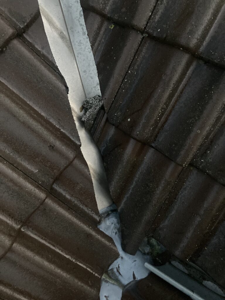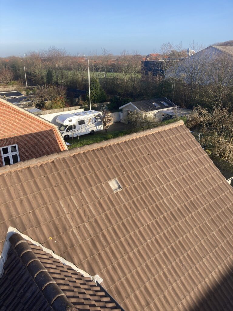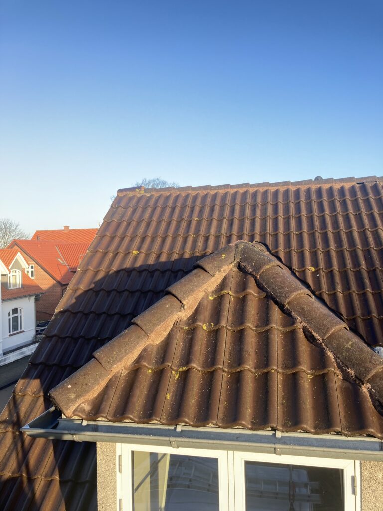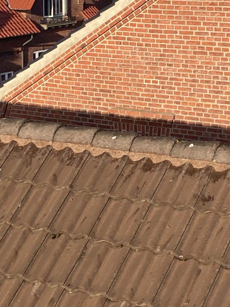 Reparation af flexsin ved rygningerne. Det løse flexsin fjernes og erstattes af nyt, hvor der ikke var fyldt helt ud, lagede jeg et tyndt lag oven på det gamle. Ud over flexsinen var der lige et par tagsten der skulle rettes, og en havelåge manglede lige et lille hjul til at bære egenvægten.