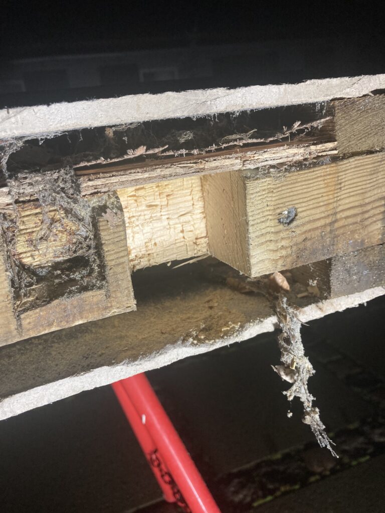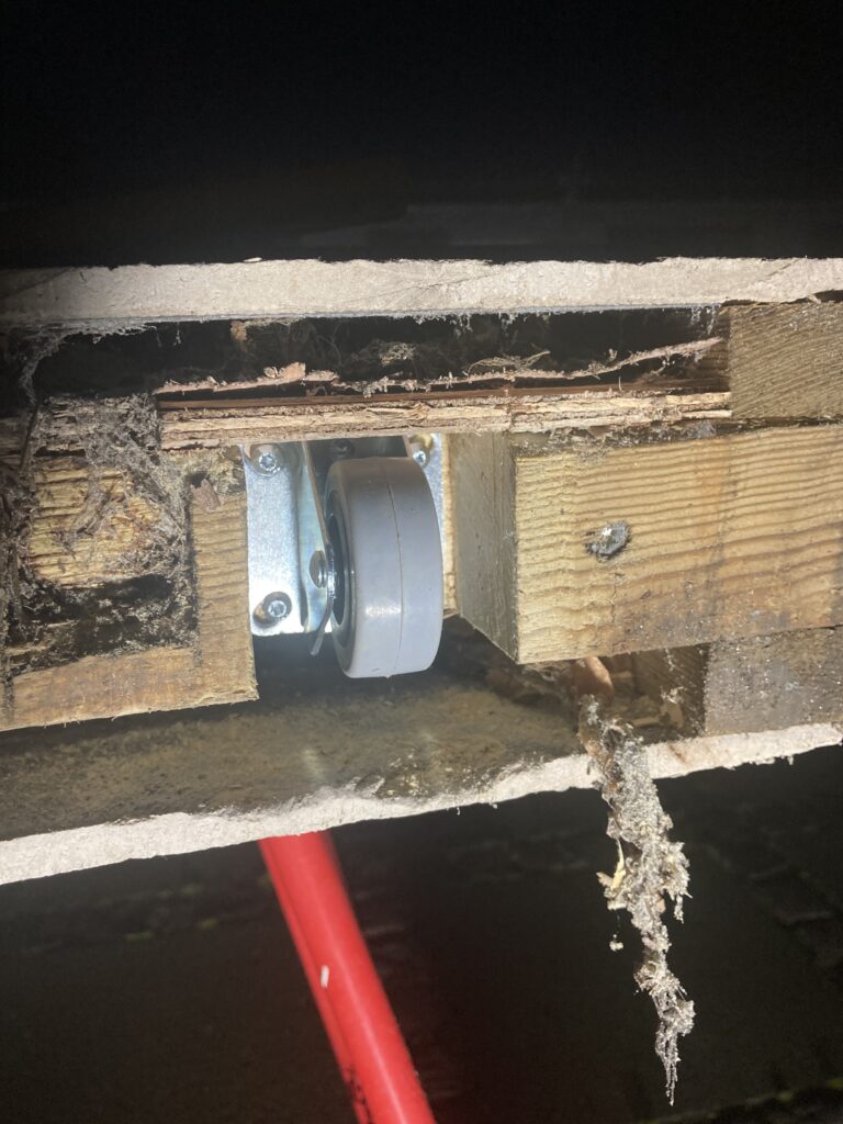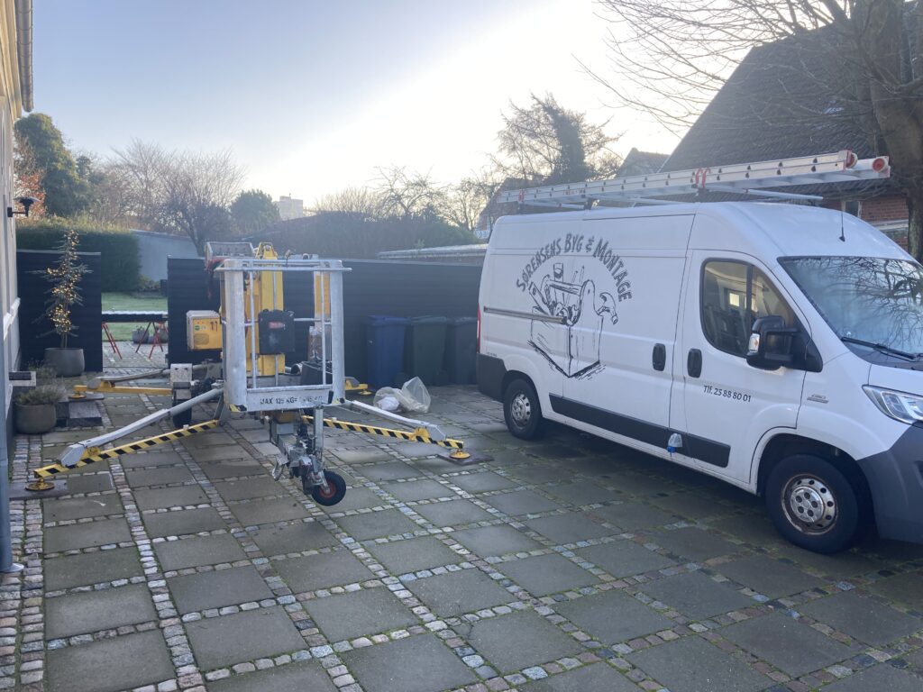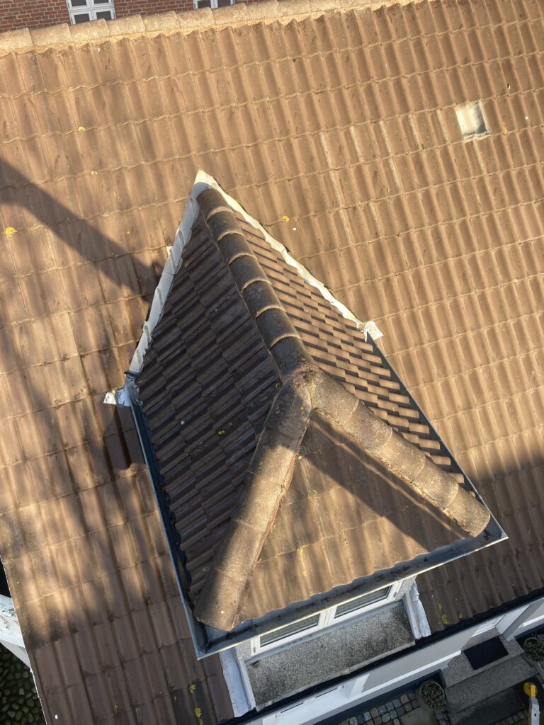 Reparation af flexsin ved rygningerne. Det løse flexsin fjernes og erstattes af nyt, hvor der ikke var fyldt helt ud, lagede jeg et tyndt lag oven på det gamle. Ud over flexsinen var der lige et par tagsten der skulle rettes, og en havelåge manglede lige et lille hjul til at bære egenvægten.