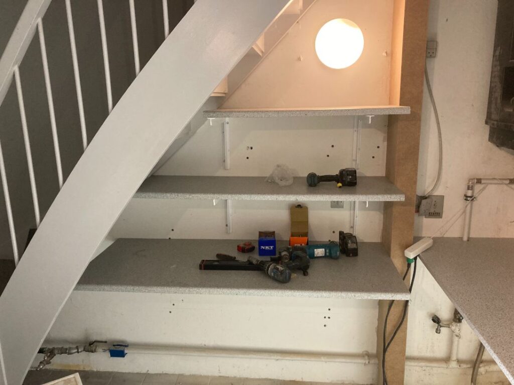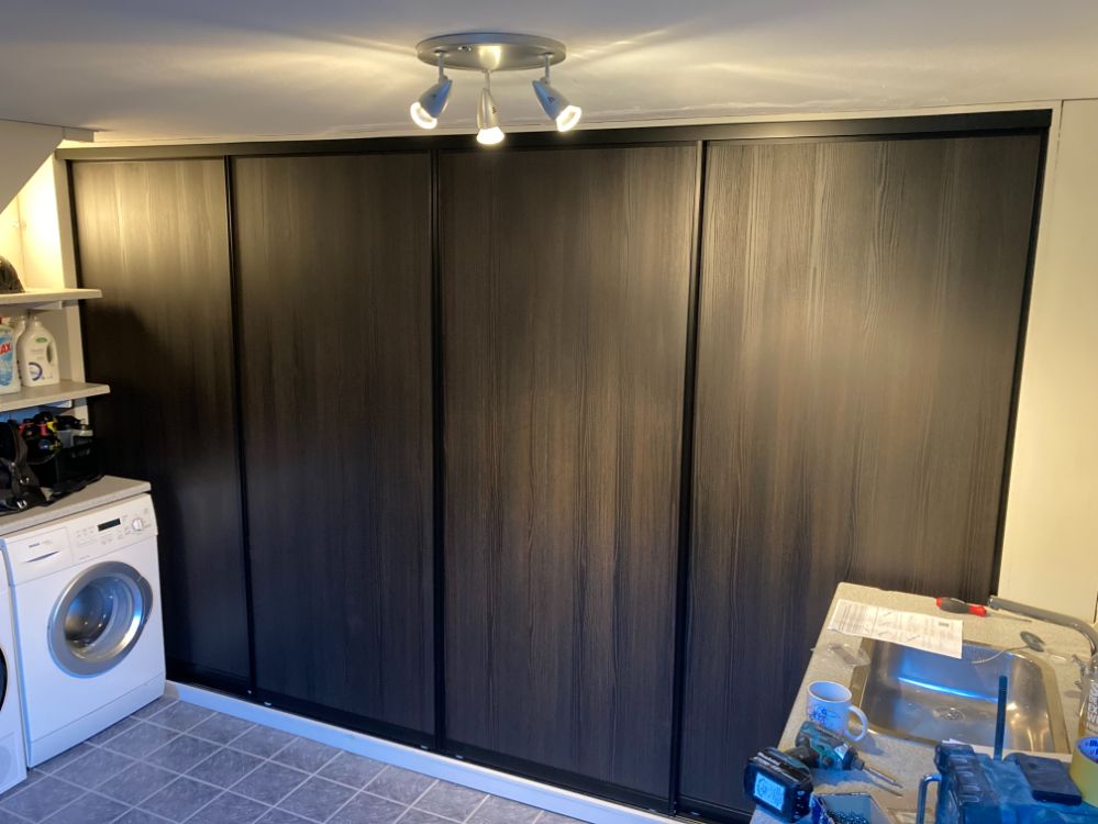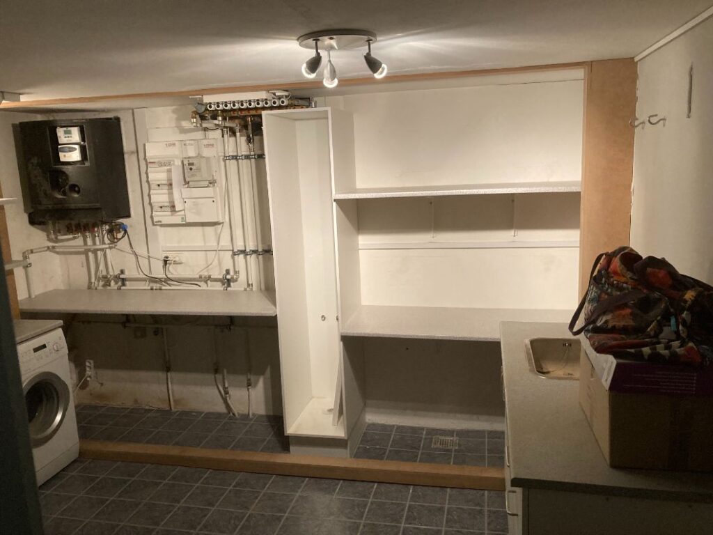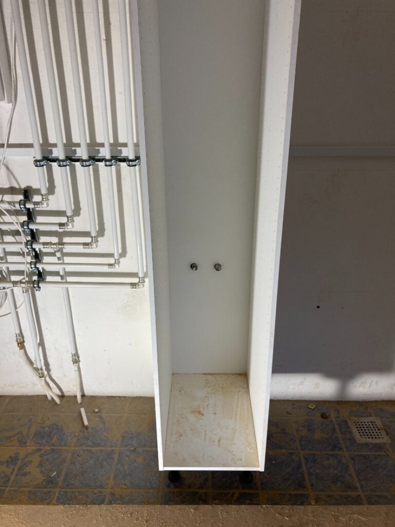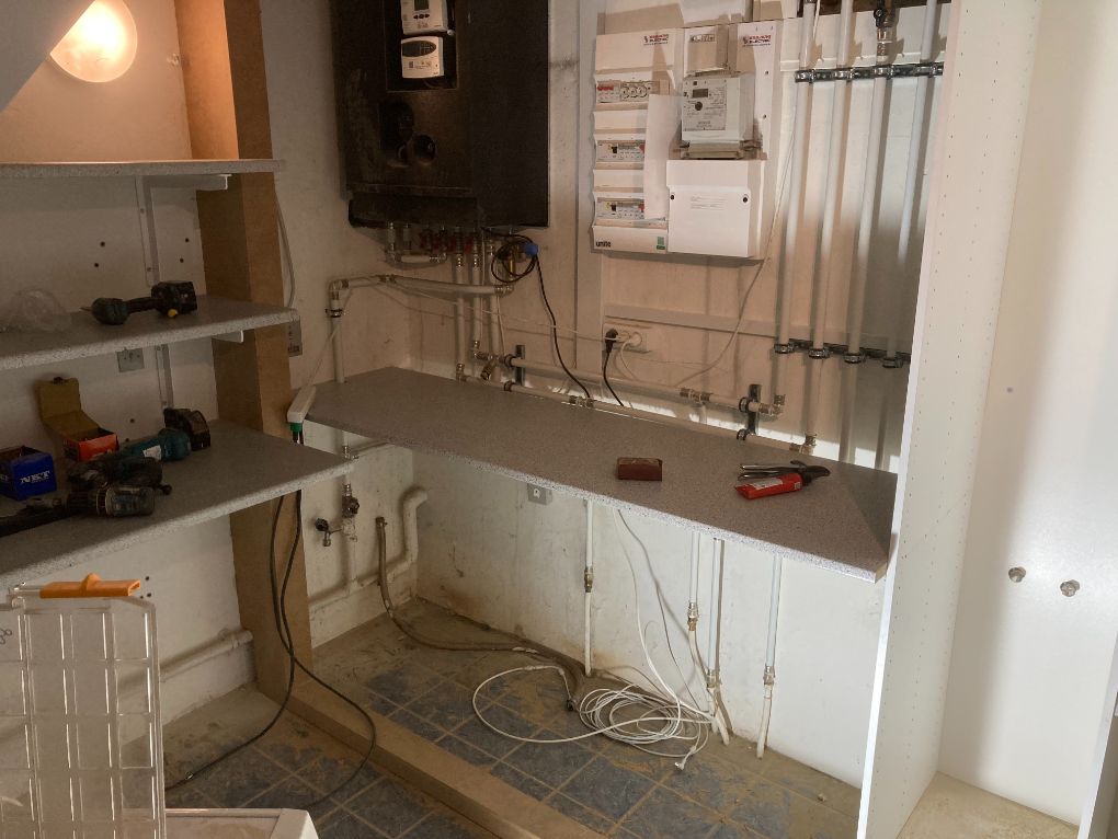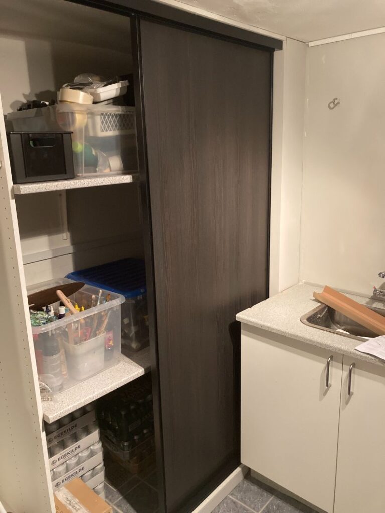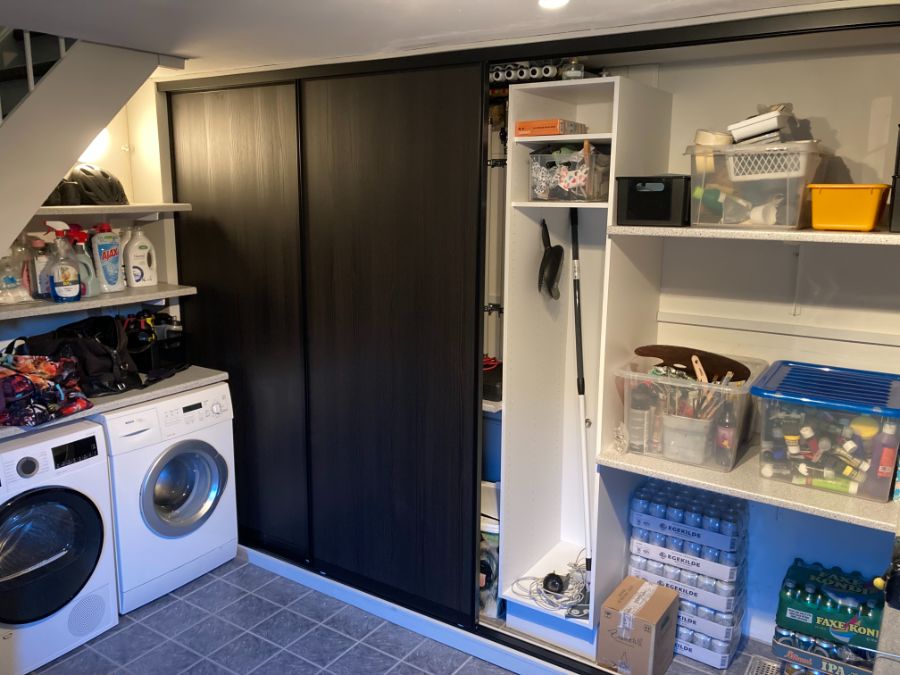 Inddækning af rør med skydelåger i bryggers, med lidt skabe og hylder til opbevaring og en bordplade til at lægge tøj sammen på.