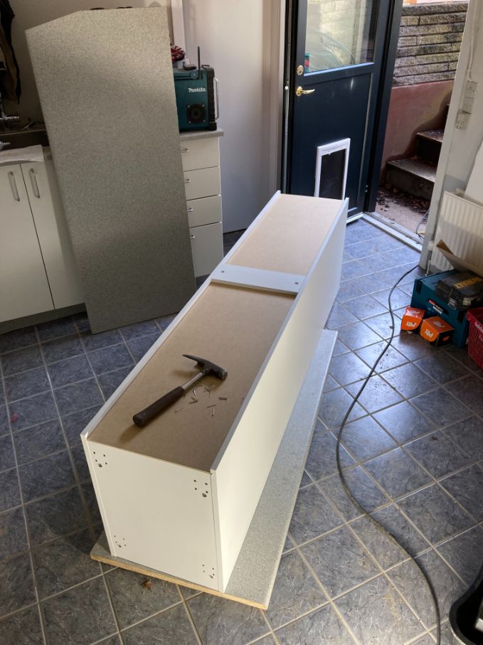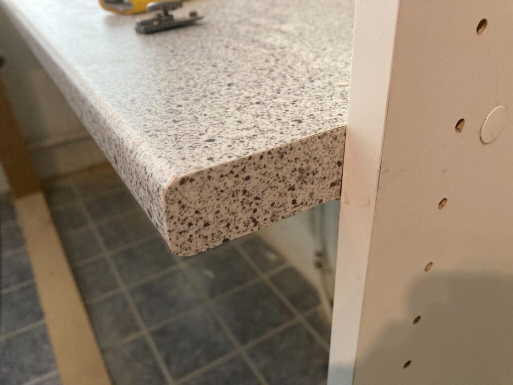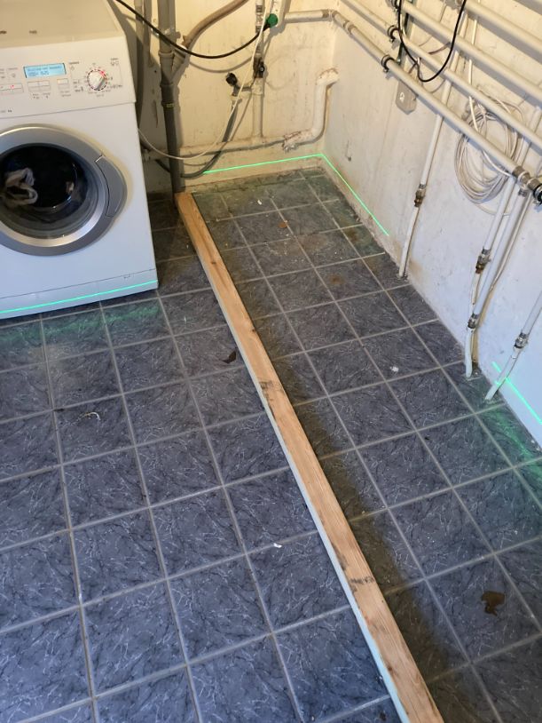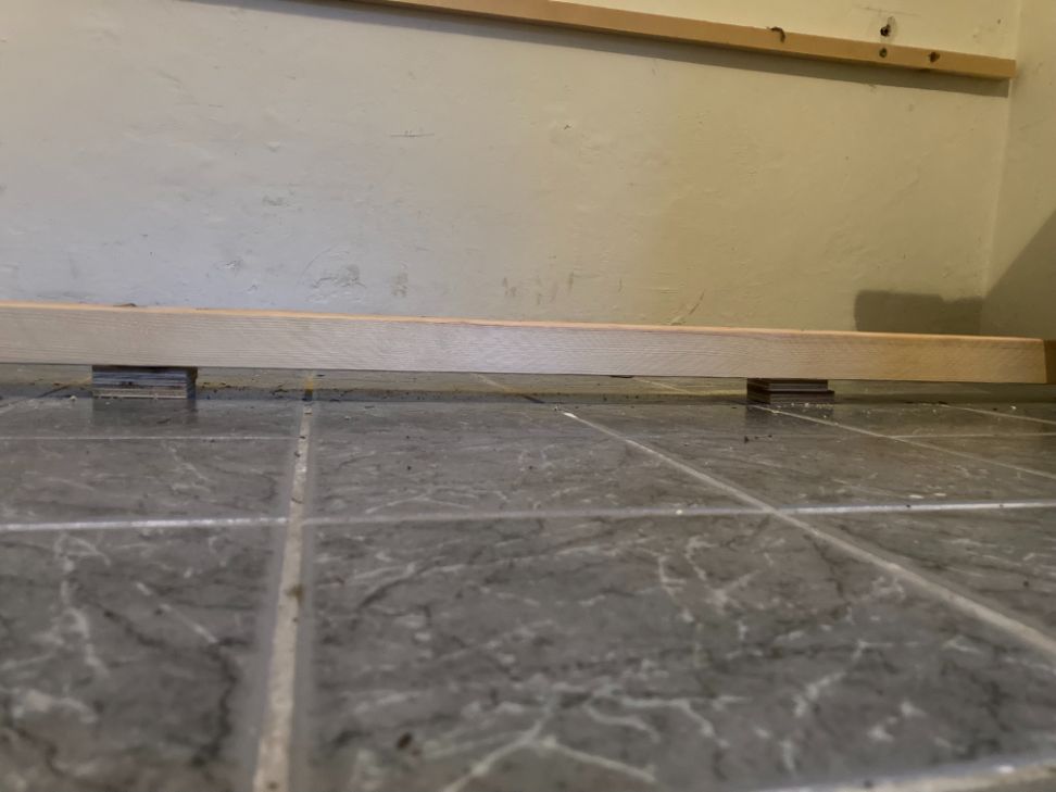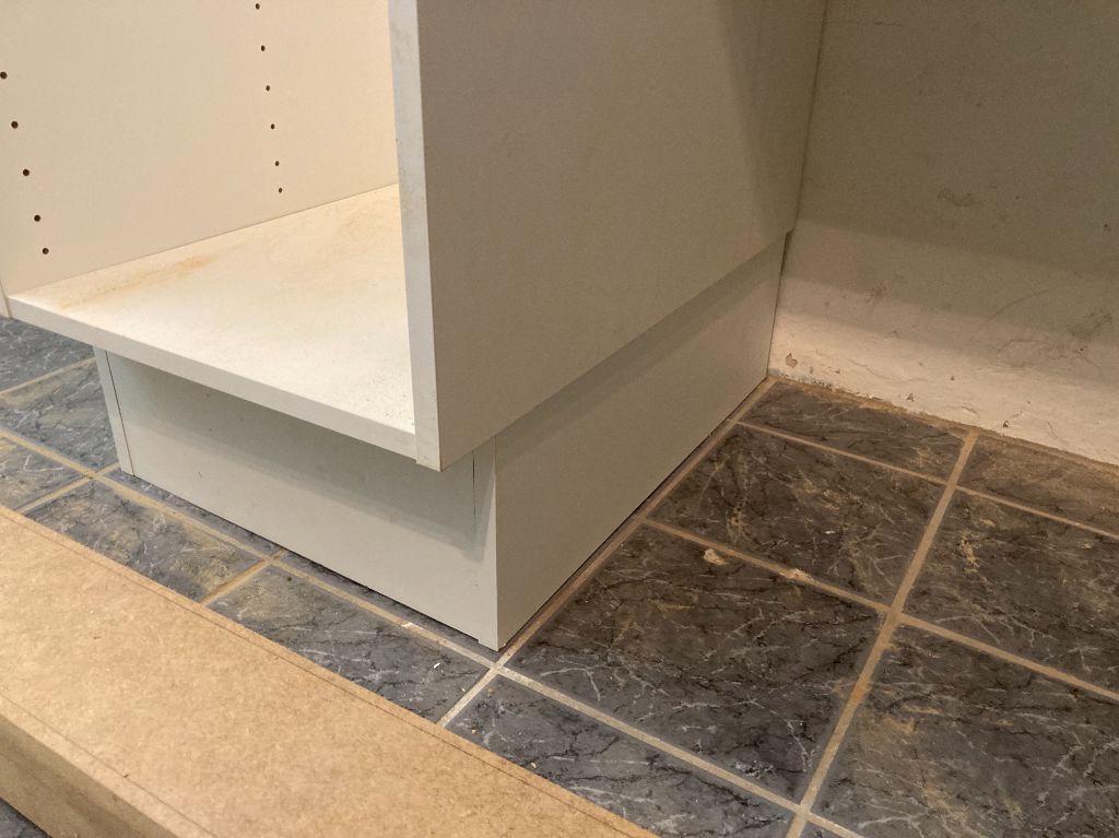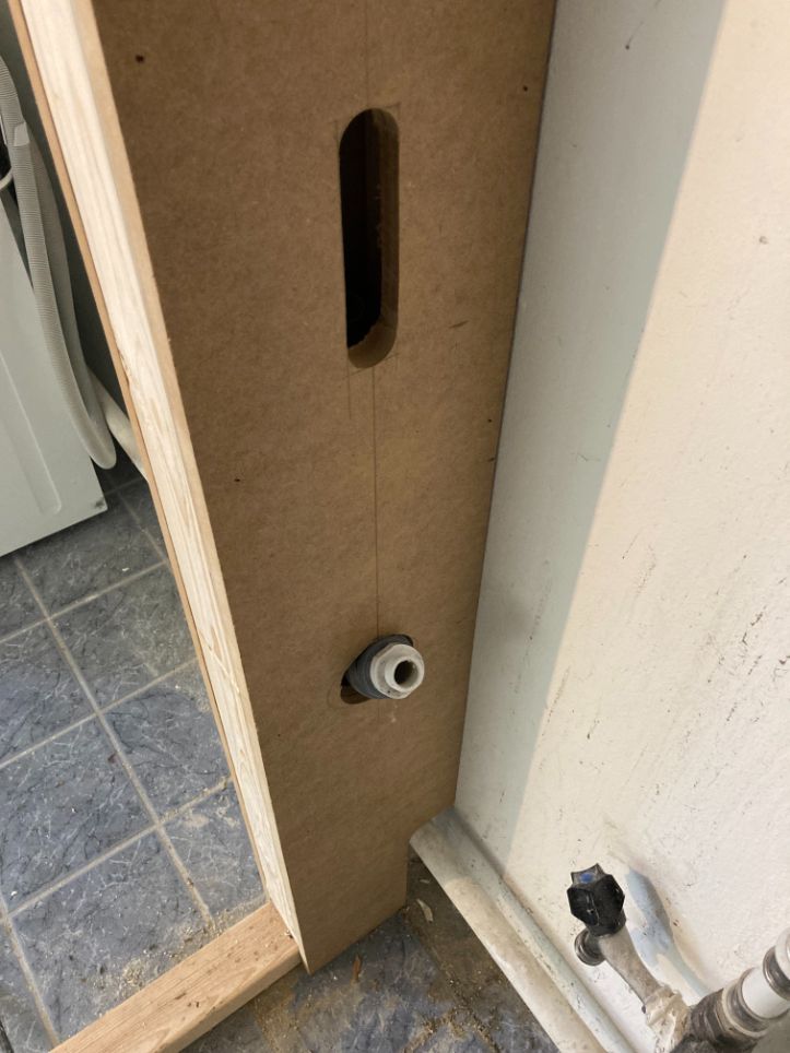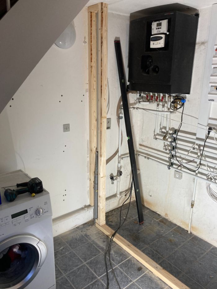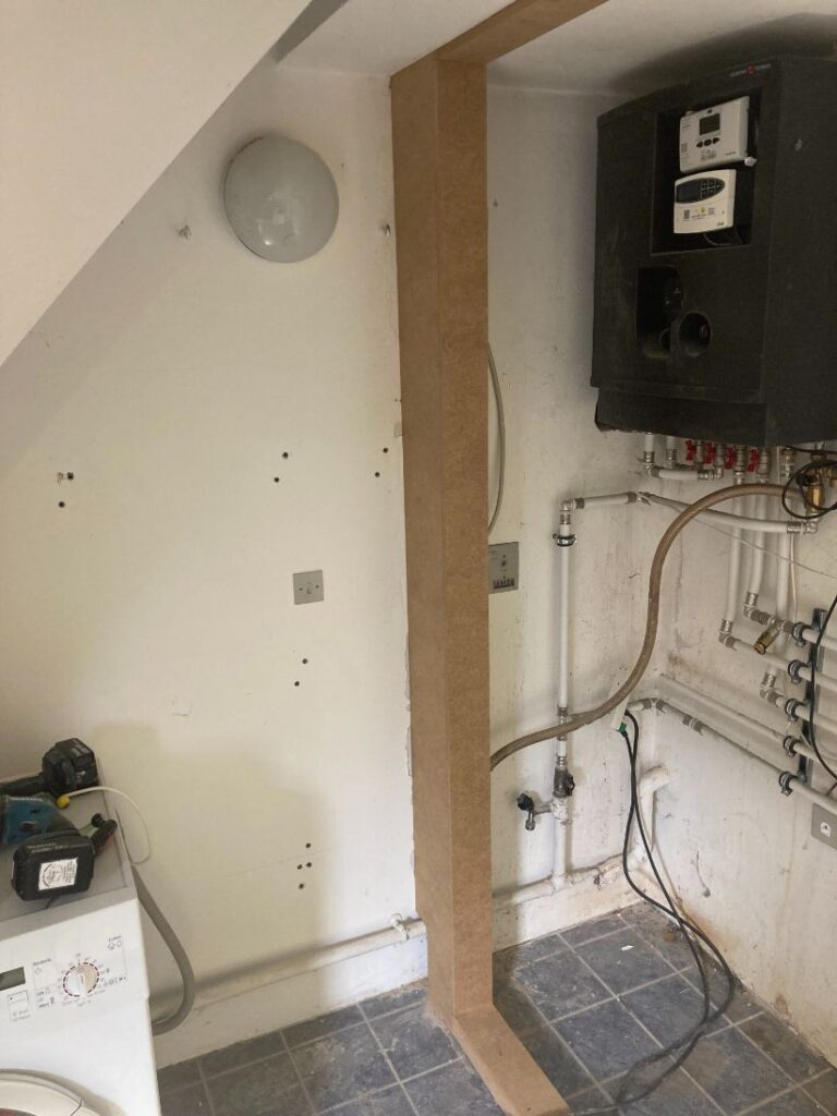 Inddækning af rør med skydelåger i bryggers, med lidt skabe og hylder til opbevaring og en bordplade til at lægge tøj sammen på.