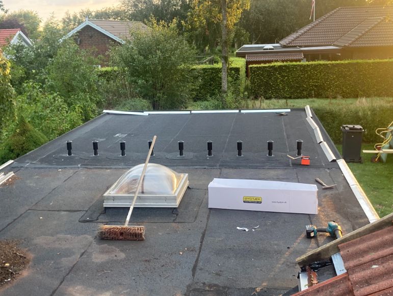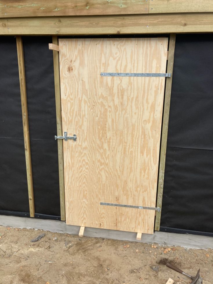 Kunden havde fået soklen støbt, efter mine anvisninger i forhold til den ønskede beklædning, gavlmuren skulle jo helst ikke være at se mere. En ret simpel konstruktion i træ, boltet fast til soklen, lidt isolering kom der også i for en god ordensskyld.