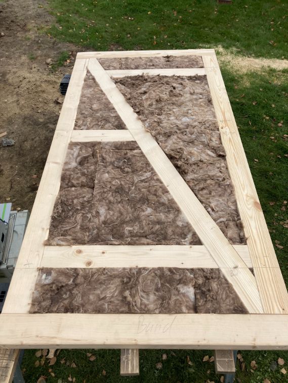 En ramme af 45x95mm regler og en 12mm plade indvendig, med en 15mm plade udvendig. Da der her skulle ned fræses hængsler i pladen, så ledes at døren aldrig sætter sig, og med det andet store plus, at hængslerne bliver skjult under beklædningen.