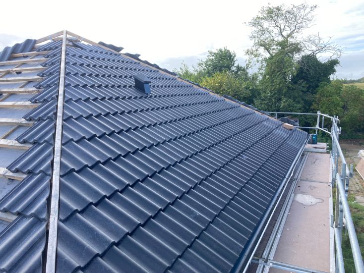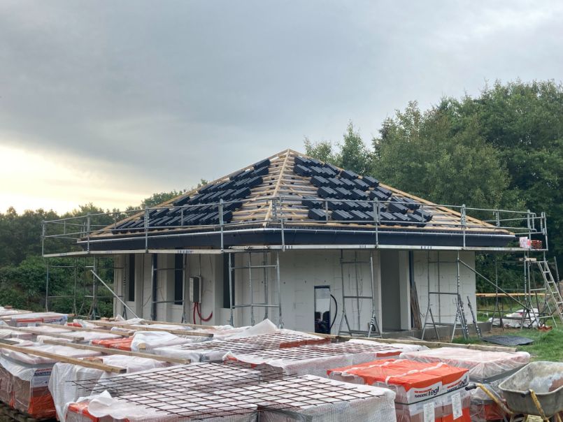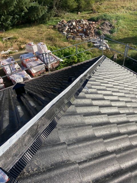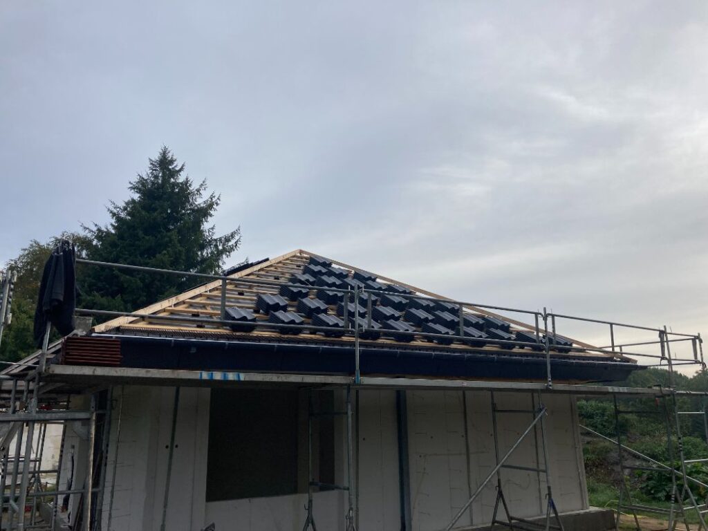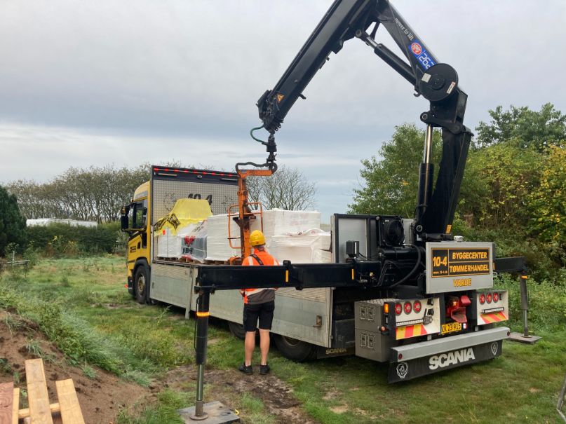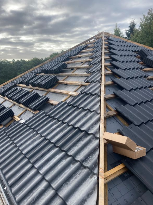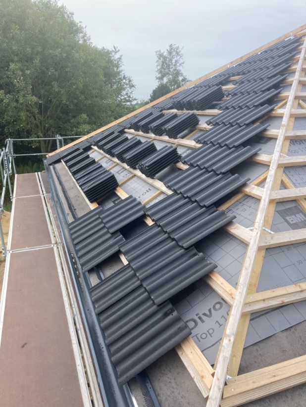 Så blev det tid til at lægge tagstenene på taget i Ølgod. 10-4 var behjælpelige med at krane tagstenene op på taget., Så der ikke skulle slæbes så meget. Tagstenene blev lagt ud lidt ad gangen på hver side, så tagkonstruktionen ikke blev trykket fra en side.