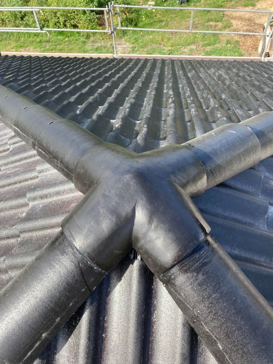 Efter at alle bundterne var lagt ud på lægterne, skulle der limes en del sammen til graterne. Da det er et pyramidetag, var der en del skæring for så lille et tag.