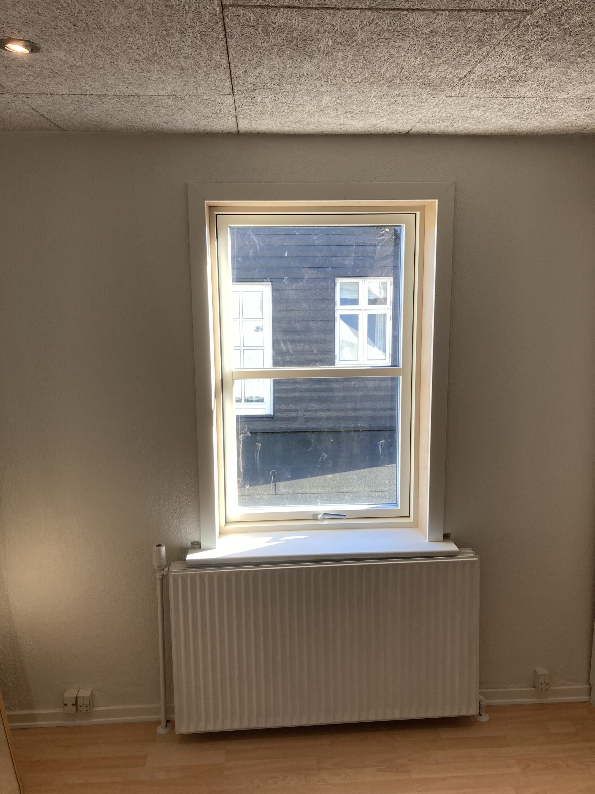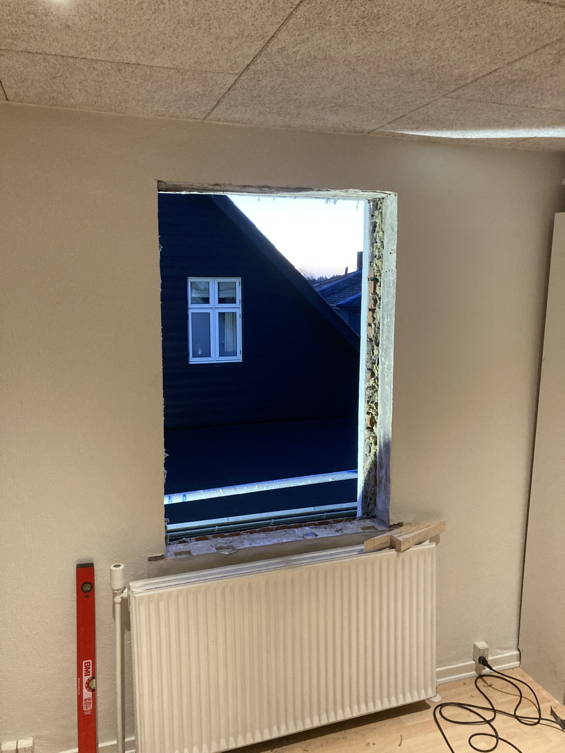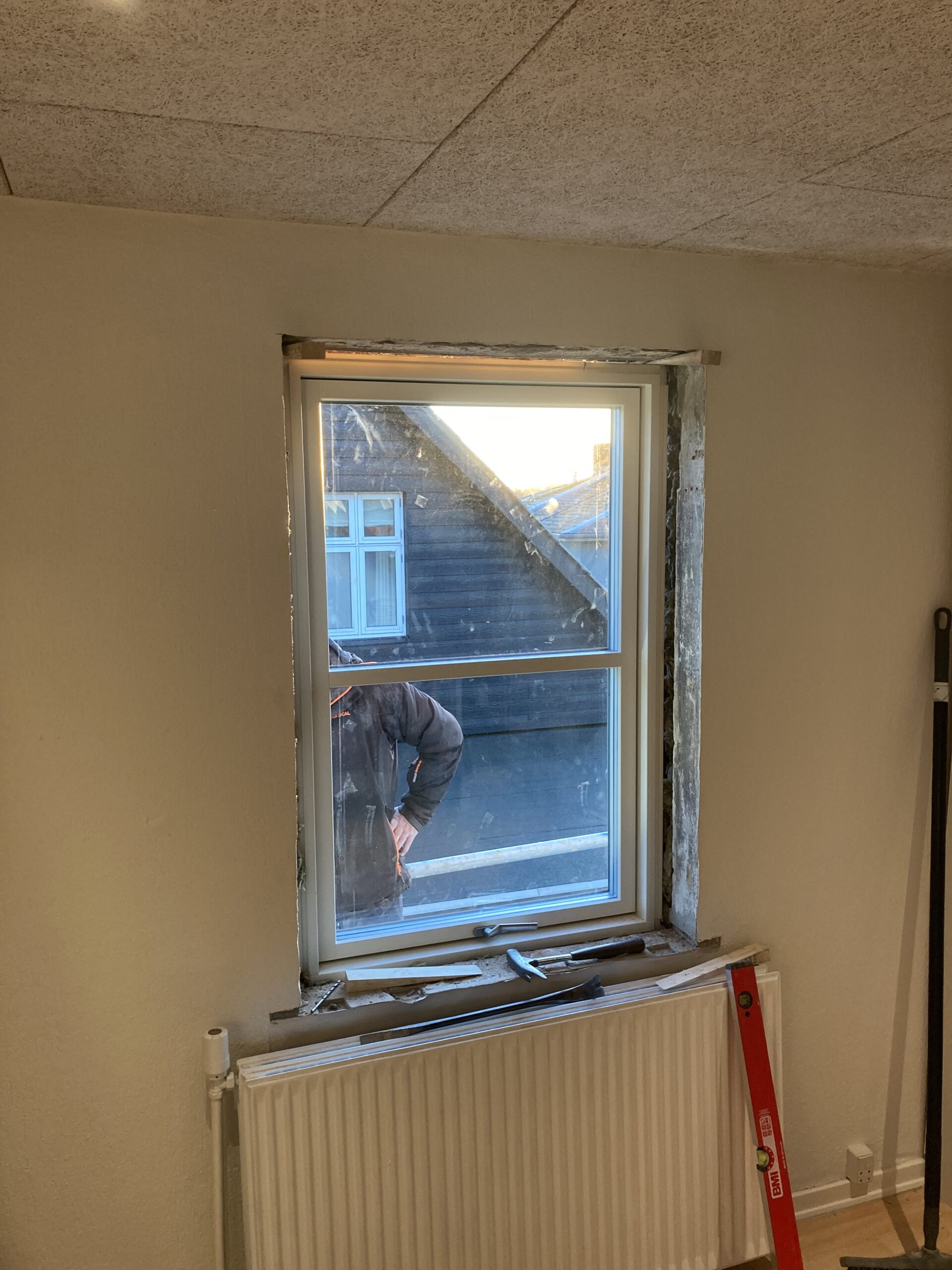 Udskiftning af vindue i gavl, samt ny lysning. Det gamle vindue var lavet med et blindstykke i toppen så det skulle naturligvis ændres, så det kunne komme lidt mere lys ind i værelset. Så gipsvæggen måtte skæres væk. Der blev monteret et vendbart vindue for at lette rengøringen af vinduet.