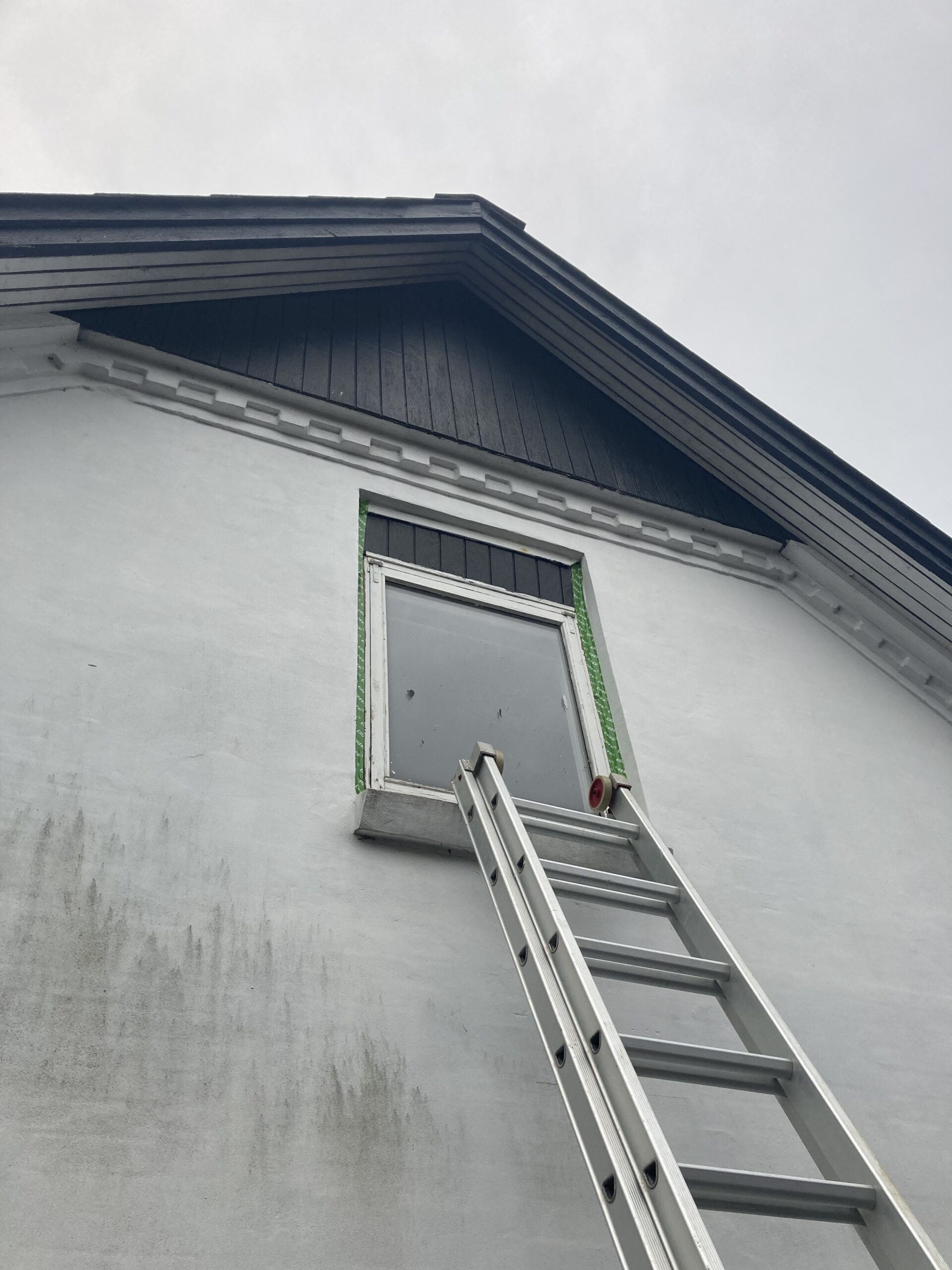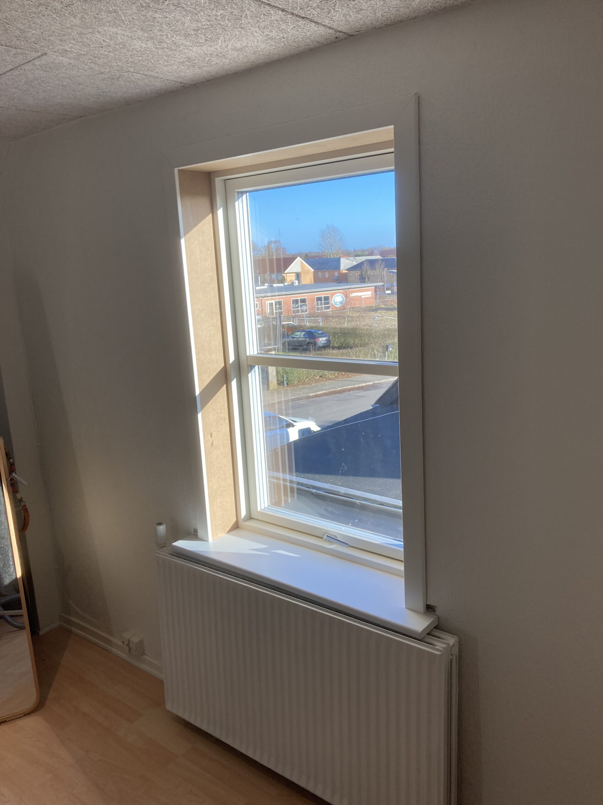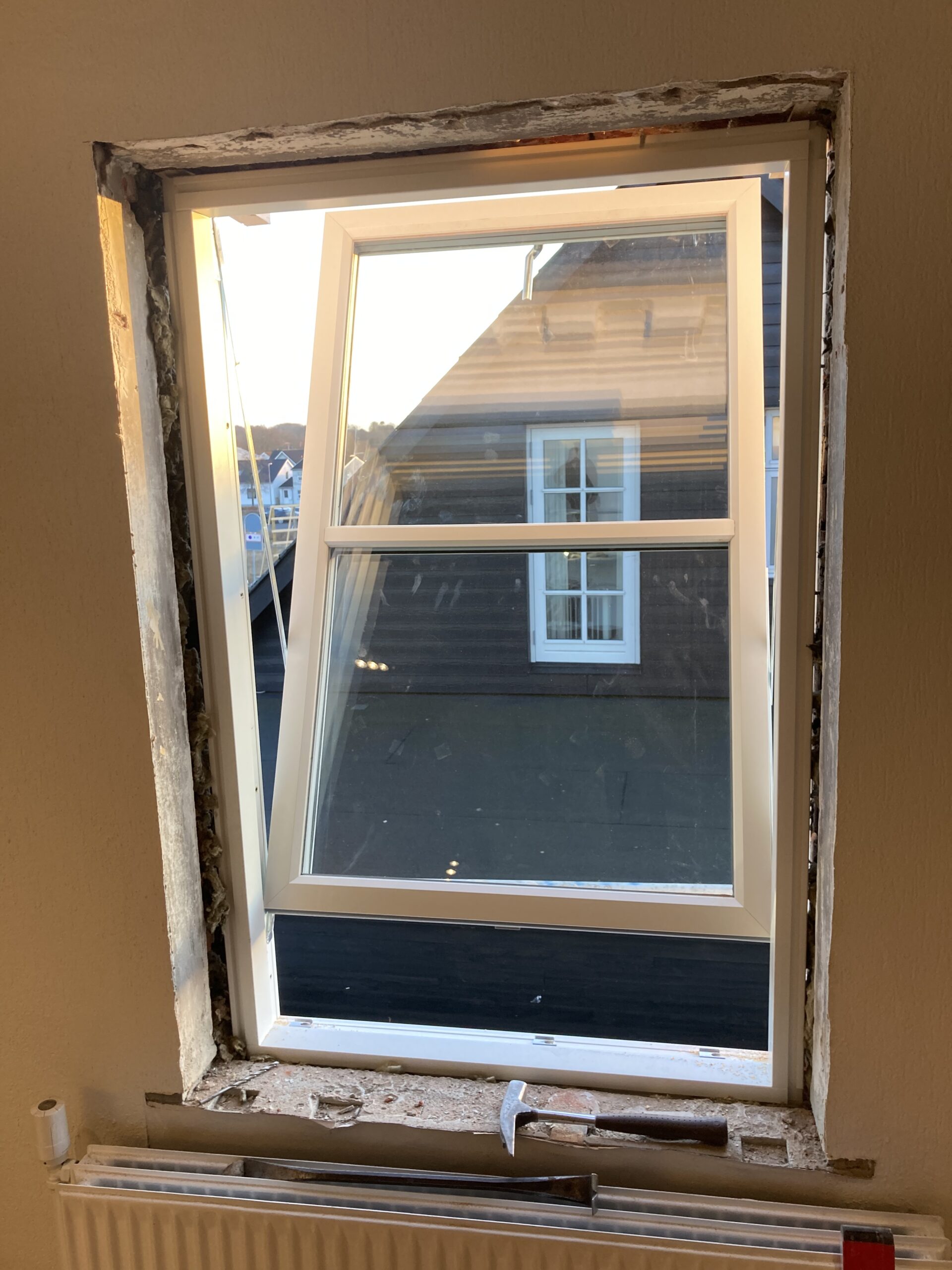 Udskiftning af vindue i gavl, samt ny lysning. Det gamle vindue var lavet med et blindstykke i toppen så det skulle naturligvis ændres, så det kunne komme lidt mere lys ind i værelset. Så gipsvæggen måtte skæres væk. Der blev monteret et vendbart vindue for at lette rengøringen af vinduet.
